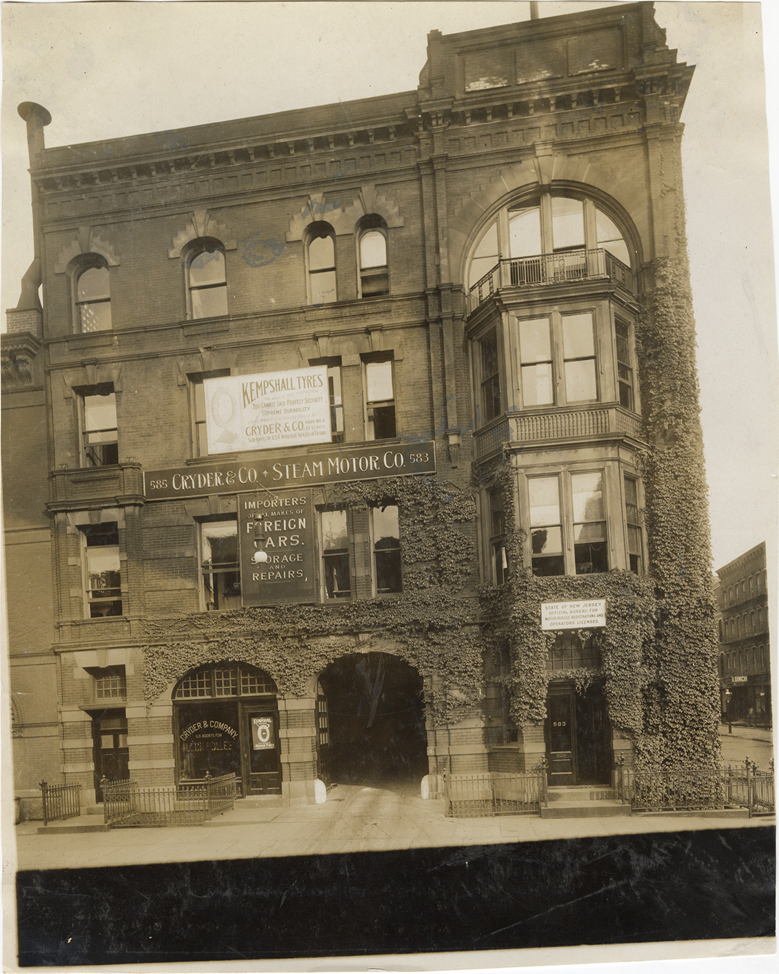 View of the Cryder & Co. dealership, located on Park Avenue. Sign on building reads: "585, Cryder & Co., Steam Motor Co., 583. Importers of all makes of foreign cars, storage and repairs." Banner for Kempshall tyres is displayed over sign. "Cryder & Company, U.S. agents for Leon Bollee" is painted on window on ground level. Stamped on back: "Photo by Spooner & Wells, Inc. 1931 Broadway, N.Y." Handwritten on back: "583-585 Park Ave., New York City."