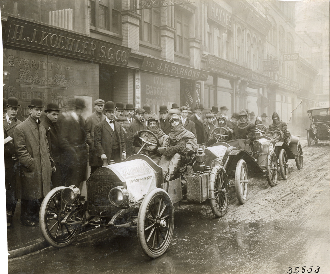 View of motorists posing in Hupmobile cars in street during the 1910 Hupmobile Detroit to New York tour. Spectators stand on sidewalk. H.J. Koehler S.G. Co. and J.H. Parsons stores in background. For this endurance run, the Hupp Motor Company sent three Hupmobiles in early January from Detroit to New York for exhibit at the Grand Central Palace Automobile Show. Stamped on back: "Spooner & Wells, Inc., photographers, telephones 3472-3473 Columbus, 1931 Broadway, New York." Handwritten on back: "Tours--Hupmobile Detroit to New York Tour, 1910."