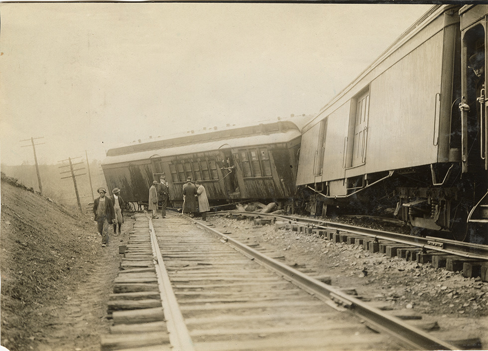 View of the aftermath of the wreck of a Southern Railroad train. Onlookers in foreground. Stamped on back: "Spooner & Wells, Inc., photographers, telephones 3472-3473 Columbus, 1931 Broadway, New York." Handwritten on back: "Wreck of Southern RR, 1909."