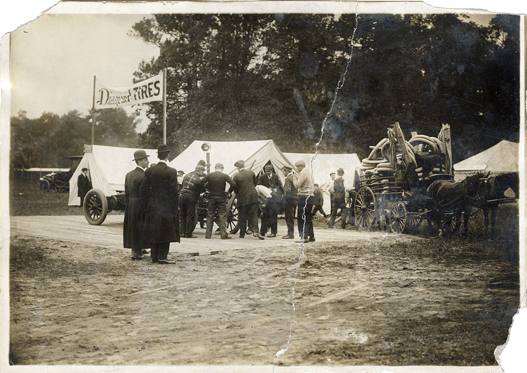 View of men surrounding a racecar in front of Diamond tires tents during an unidentified event. Horse-drawn wagon stacked with tires on right. Diamond tires banner in background. Handwritten on back: "Diamond camp busy."