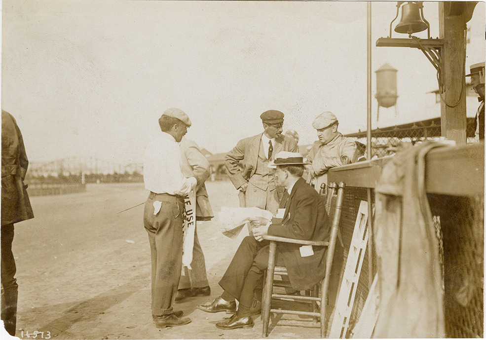 View of group of officials along fence during 1907 races at Morris Park, New York. Stamped on back: "Photo by N. Lazarnick, 29 West 42nd Street, N.Y., tel. 594 Bryant." Handwritten on back: "Races and racing--Morris Park, 1907."