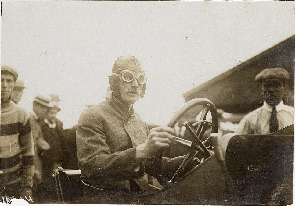 Harry Cobe posing in racecar, 1907 Morris Park races