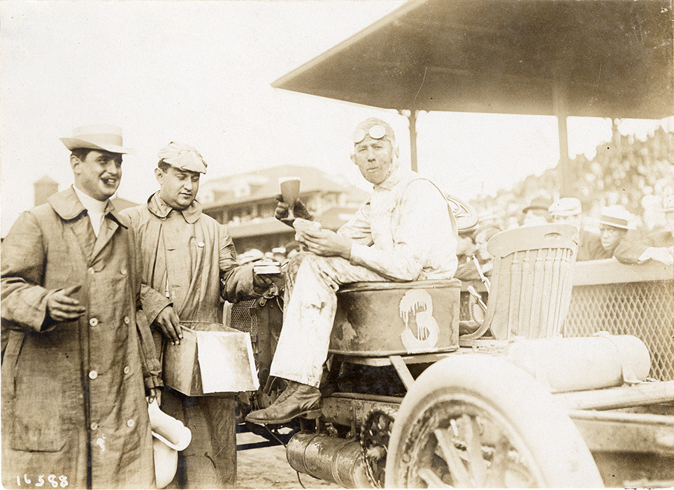 Ralph Mulford eating and drinking in Lozier racecar, 1907 Morris Park races
