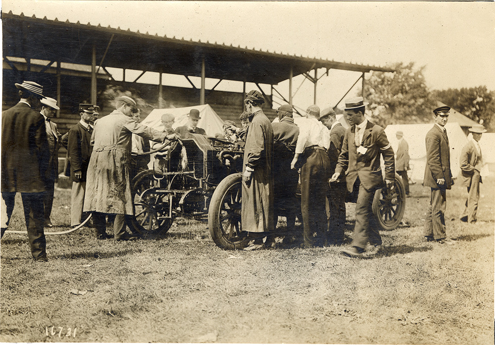 Men surrounding De Dietrich racecar, 1907 Morris Park races