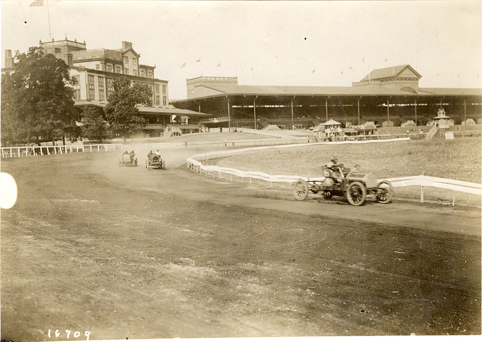 View of cars racing on track during the 1907 races at Morris Park, New York. Handwritten on back: "Races and racing--Morris Park, 1907."