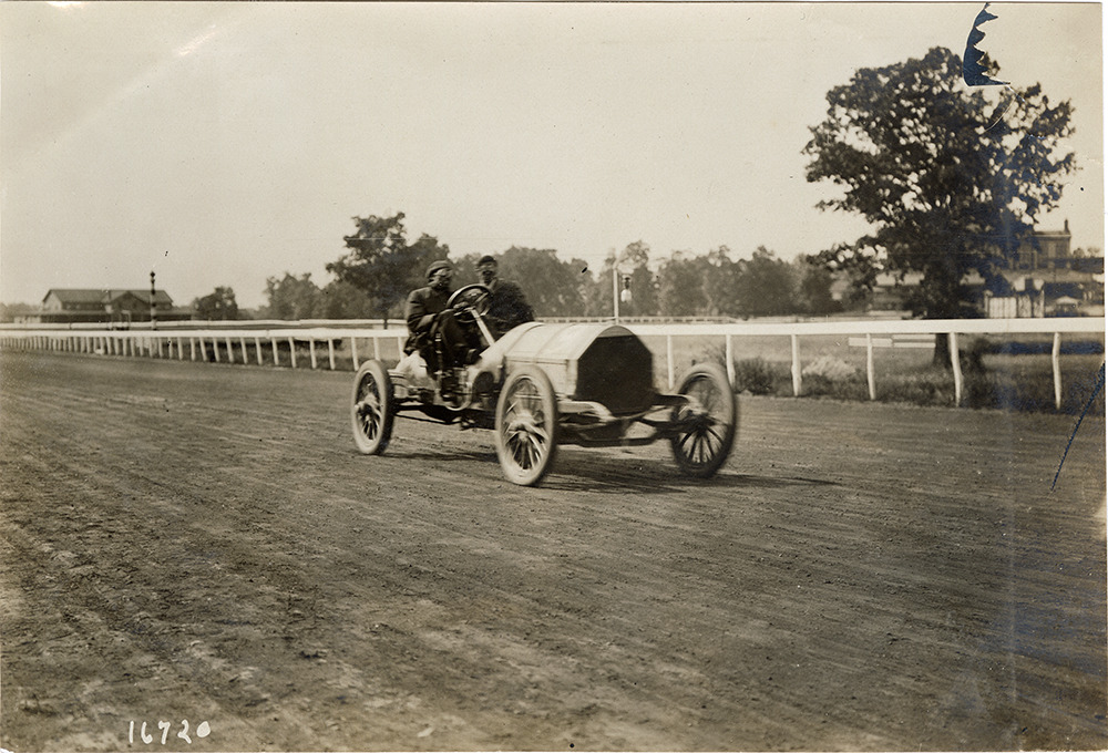 View of driver and passenger racing car on track during the 1907 races at Morris Park, New York. Handwritten on back: "Races and racing--Morris Park, 1907."