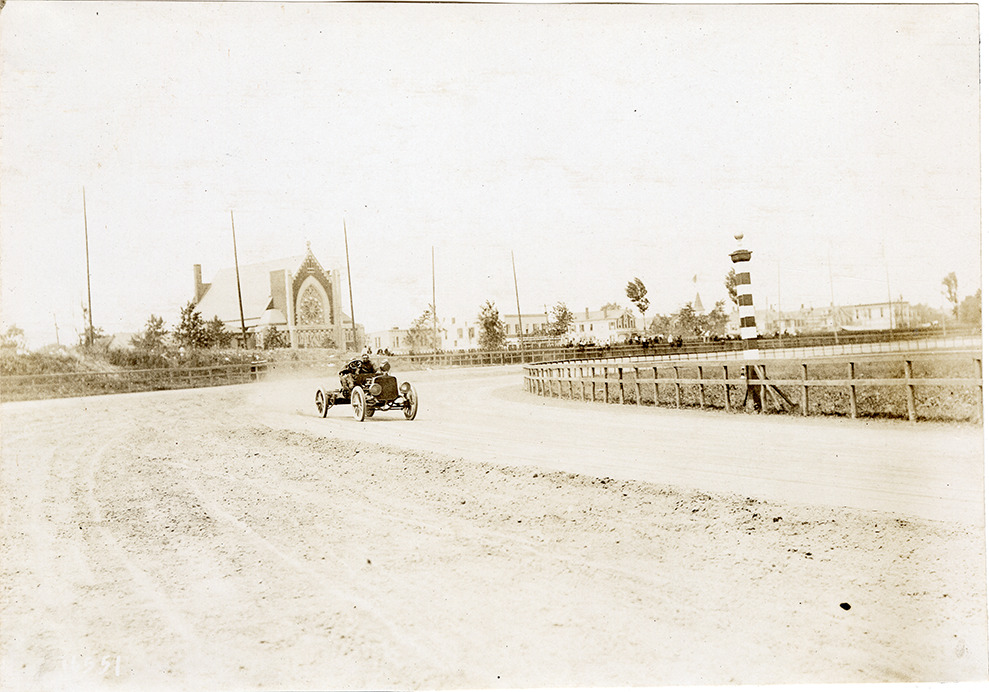 View of driver and passenger racing Lozier car no. 3 on track during the 1907 races at Morris Park, New York. Stamped on back: "Photo by N. Lazarnick, 29 West 42nd Street, N.Y., tel. 594 Bryant." Handwritten on back: "Lozier #3. Races and racing--Morris Park, 1907."