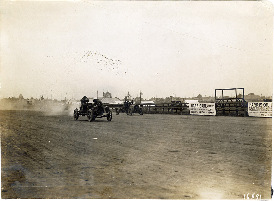 View of Thomas and Darracq cars racing on track during the 1907 races at Morris Park, New York. Stamped on back: "Photo by N. Lazarnick, 29 West 42nd Street, N.Y., tel. 594 Bryant." Handwritten on back: "Thomas & Darracq. Races and racing--Morris Park, 1907."