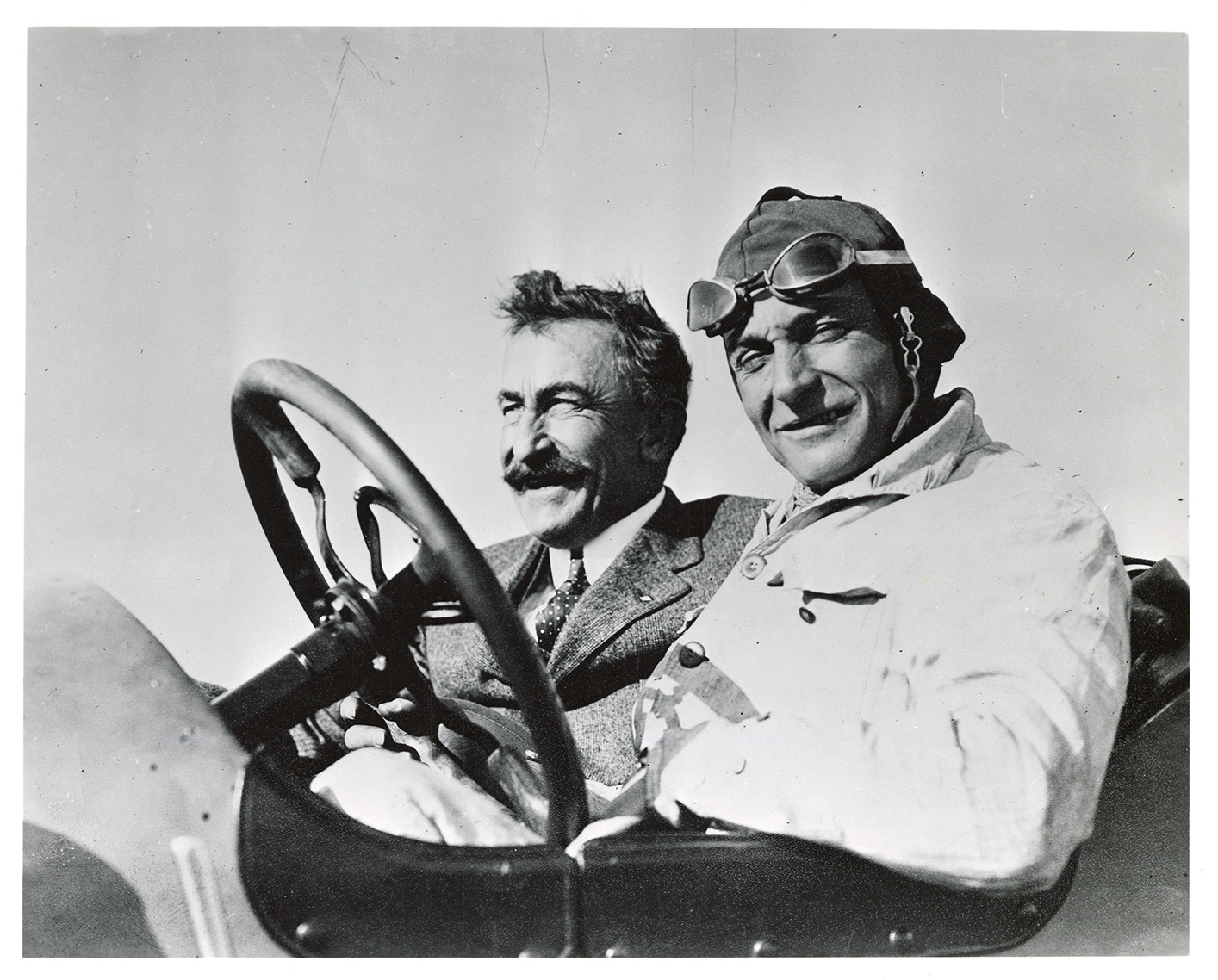 Henry Bourne Joy and Jesse G. Vincent posing in Packard Special Twin Six racecar, Sheepshead Bay