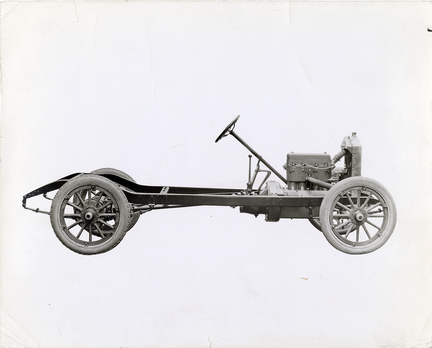 View of the chassis for a Gray car. Stamped on back: "Spencer & Wyckoff, commercial photographers, Smith Bldg., Detroit." Handwritten on back: "Gray chassis."
