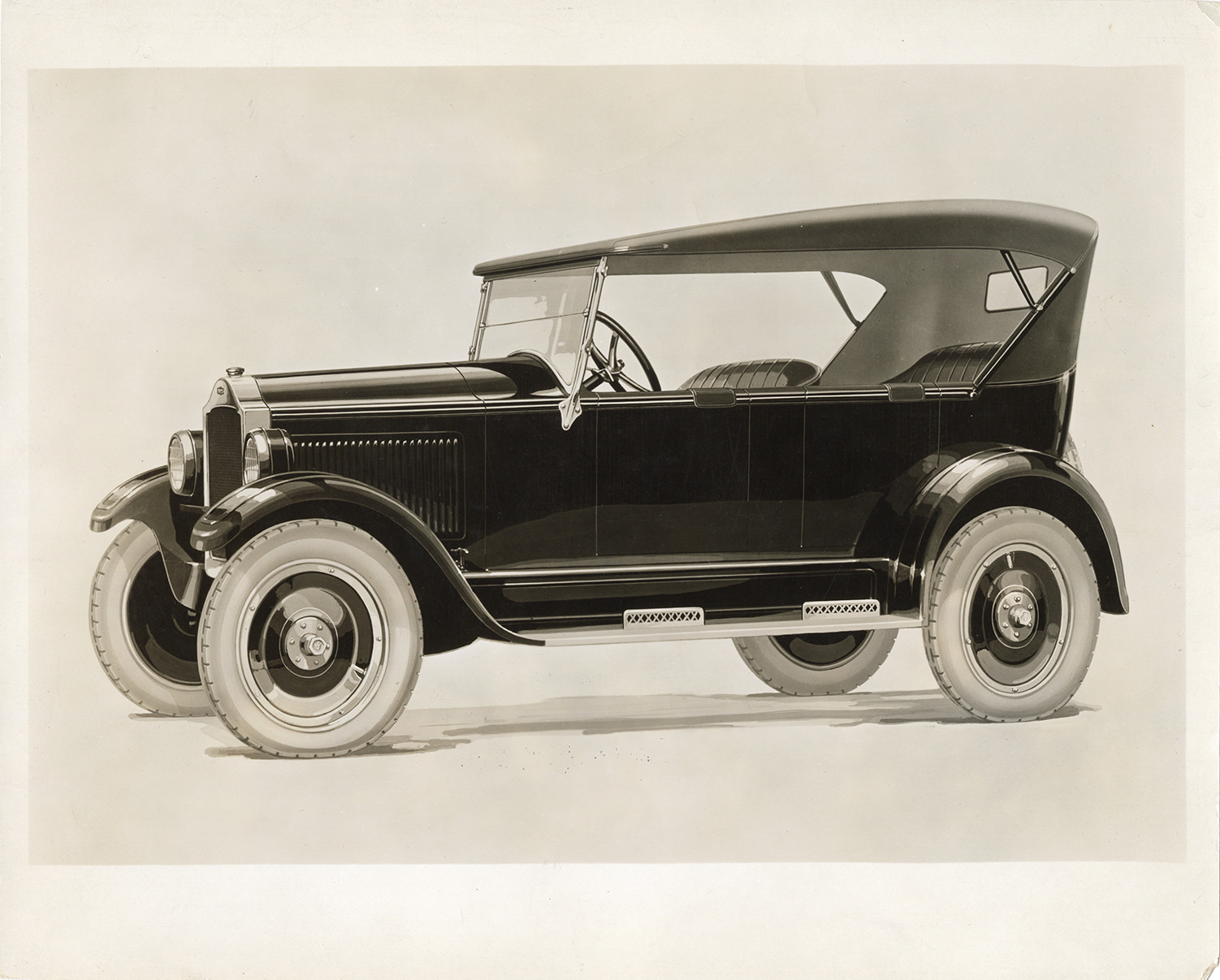 View of a 1924 Gray special touring car. Label on back: "Gray special touring. Body, hood, and wheels are painted a rich maroon, striped with gold. Radiator and windshield stanchions are nickeled. Black fenders, splashers and chassis. Khaki colored top. Dark maroon overstuffed upholstery. Snubbers front and rear. Disc wheels, balloon tires and scuff plates are standard." Stamped on back: "MacGregor and Vallin, commercial photography, 10629, reorder by above number, 4612 Woodward Ave., Detroit, Mich." Handwritten on back: "Gray, 1924."