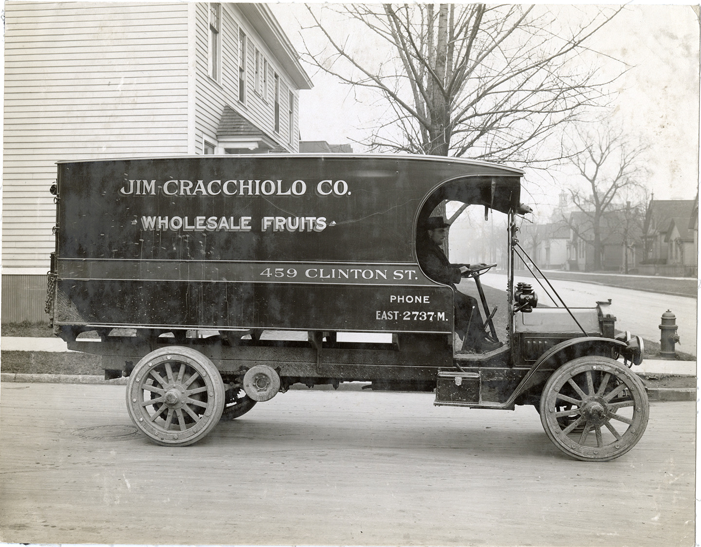 View of driver posing in a Federal truck for Jim Cracchiolo Co. Lettered on side of truck: "Jim Cracchiolo Co., wholesale fruits, 459 Clinton St., Phone East 2737M." Stamped on back: "From Federal Motor Truck Co., Detroit, Mich." Handwritten on back: "c. 1915."