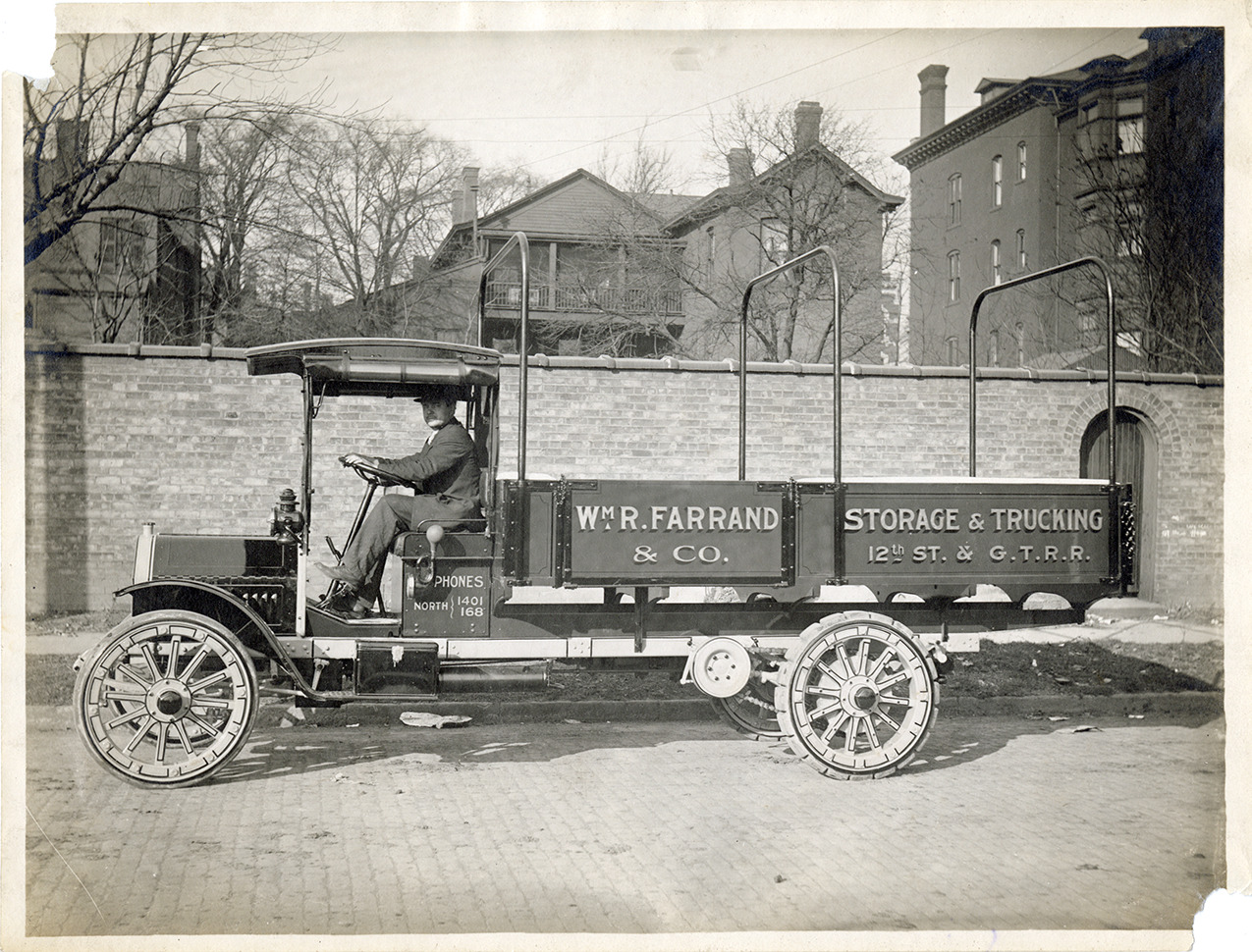 View of driver posing in a Federal truck for William R. Farrand & Co. Lettered on side of truck: "Wm. R. Farrand & Co., storage & trucking, 12th St. & G.T.R.R." Handwritten on back: "c. 1915."