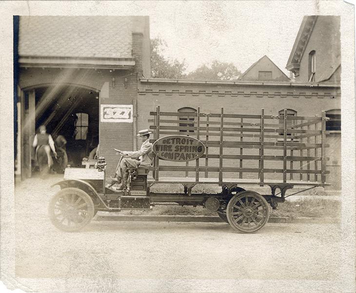 Favorite this☆ Driver posing in Federal truck, Detroit Wire Spring Company Description: View of driver posing in a Federal truck for the Detroit Wire Spring Company. Garage in background. Handwritten on back: "c. 1915." Details Resource ID: na052645 Subject: Trucks Federal Motor Truck Company Wire products industry--Michigan--Detroit Photographic prints Date Issued: 1915 (year approximate) Format: 1 photographic print ; 4 x 5 in. Member of: National Automotive History Collection Filing Location: Motor trucks--Federal Rights: Physical rights are retained by DPL. Copyright is retained in accordance with U.S. copyright laws.