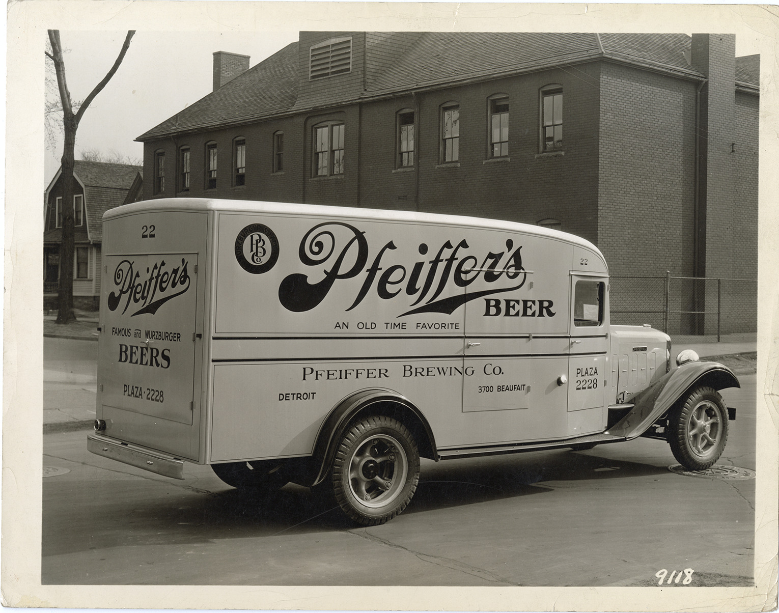 View of a Federal truck for the Pfeiffer Brewing Co. Lettered on truck: "Pfeiffer's beer, an old time favorite. Pfeiffer Brewing Co., 3700 Beaufait, Detroit, Plaza 2228. Pfeiffer's famous and Wurzburger beers, Plaza-2228." Handwritten on back: "c. 1931."