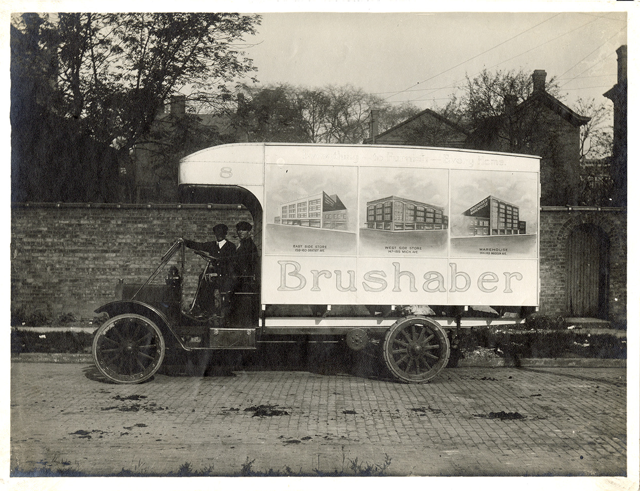 Favorite this☆ Federal truck, J. Brushaber & Sons Description: View of driver and passenger posing in a Federal truck for J. Brushaber & Sons. Images of the east side store, west side store and warehouse are depicted on the side of the truck with "Brushaber." Handwritten on back: "c. 1915." Details Resource ID: na052647 Subject: Trucks Federal Motor Truck Company House furnishings industry and trade--Michigan--Detroit Delivery of goods--Michigan--Detroit Photographic prints Date Issued: 1915 (year approximate) Format: 1 photographic print ; 6.5 x 8.5 in. Member of: National Automotive History Collection Filing Location: Motor trucks--Federal Rights: Physical rights are retained by DPL. Copyright is retained in accordance with U.S. copyright laws.