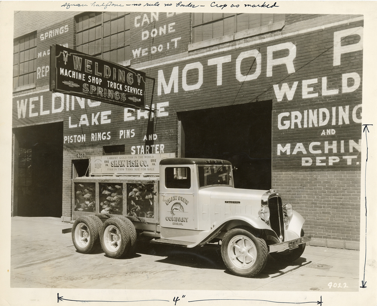 View of a Federal truck for the Shaw Fish Co. parked in front of service station garage. Lettered on truck: "Shaw Fish Co., Erie, Pa. Largest goldfish in the world. Fish in this tank are for sale. Shaw Fish Company, Erie, Pa." Sign on building reads: "Welding, machine shop, truck service, springs." Label on back: "Gold fish distribution goes modern. The Shaw Fish Company of Erie, Pa., go out after business literally with this 3-ton Federal six wheel truck equipped with a glass tank of several hundred gallon capacity. At night the truck is lighted with neon lights which add greatly to its advertising value. The six wheel type of truck, because of its exceptional easy riding qualities, was selected for this service to protect the costly glass tank from jars and strains that might cause leakage."