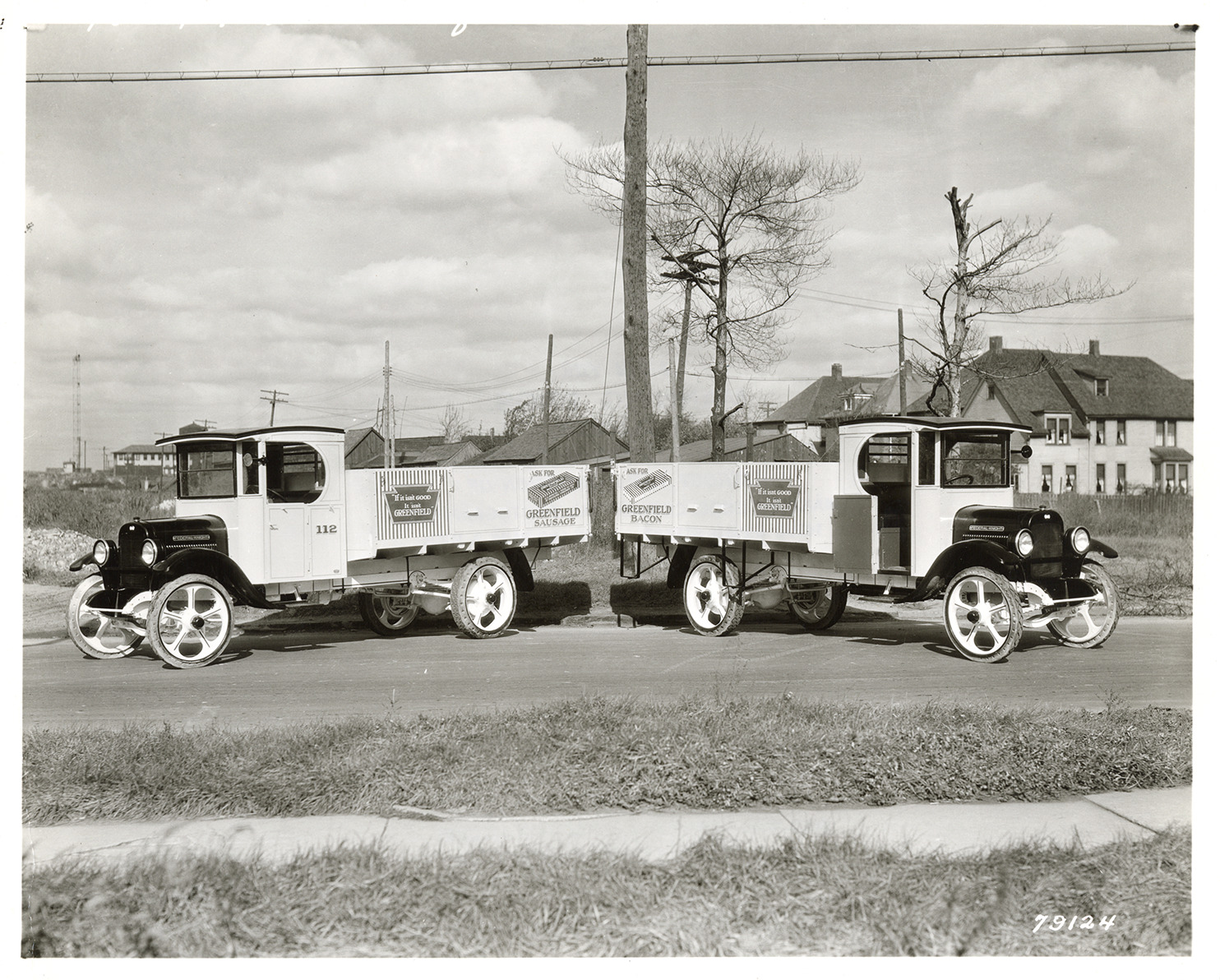 View of two Federal-Knight trucks used for delivering Greenfield sausage and bacon. Lettered on truck: "Ask for Greenfield sausage; ask for Greenfield bacon. It it isn't good, it isn't Greenfield." Stamped on back: "From the Manning Bros. collection. This photo may not be reproduced without the permission of Manning Bros. commercial photographers, 16300 Brush Street, Highland Park 3, Mich." Handwritten on back: "Federal-Knight, Nov. 1926."