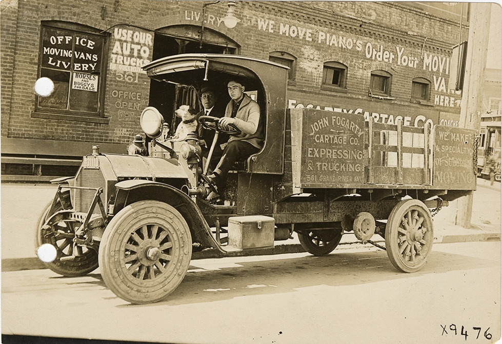 View of driver, passenger and dog posing in a Federal truck for the John Fogarty Cartage Co. Lettered on truck: "John Fogarty Cartage Co. Expressing & trucking, 561 Grand River Ave." Brick building in back has signs reading: "Office, moving vans, livery. Horses and buggys for sale. Use our auto trucks. We move pianos. Order your moving van here." Handwritten on back: "Photo taken for Gibney Tire & Rubber Co., ca. 1915."