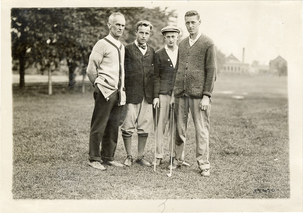 View of four golfers posing with golf clubs during the U.S. National Amateur Golf Championship held at the Country Club of Detroit from August 28 to September 4, 1915. Stamped on back: "Spooner & Wells, Inc., photographers, telephone North 1745. 1231 Woodward Ave., Detroit, Mich. Detroit, 1231 Woodward, New York, 1931 Broadway."