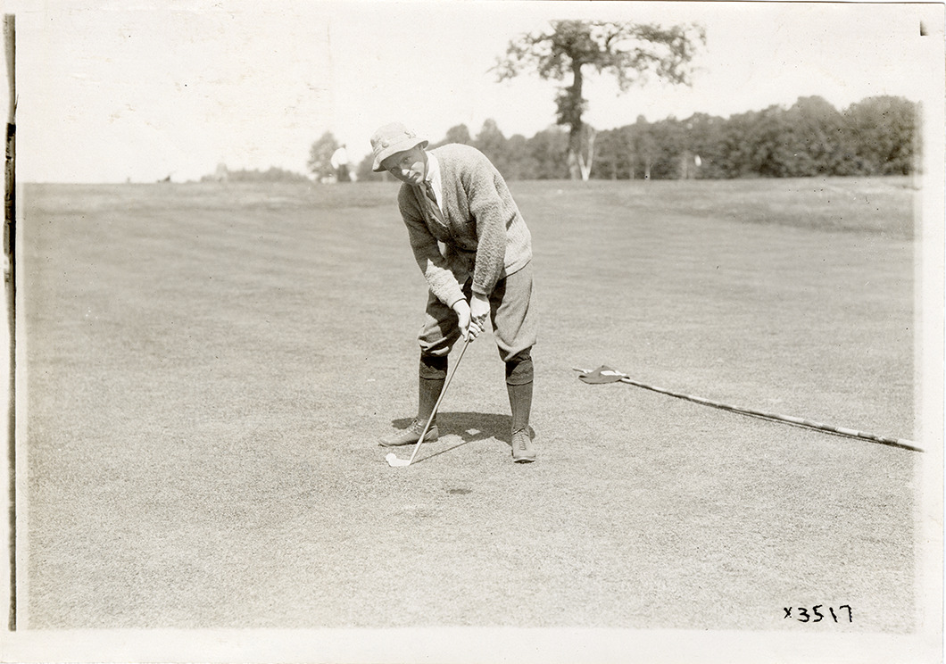 View of golfer Paul Hunter posing with golf club during the U.S. National Amateur Golf Championship held at the Country Club of Detroit from August 28 to September 4, 1915. Handwritten on back: "Paul Hunter."