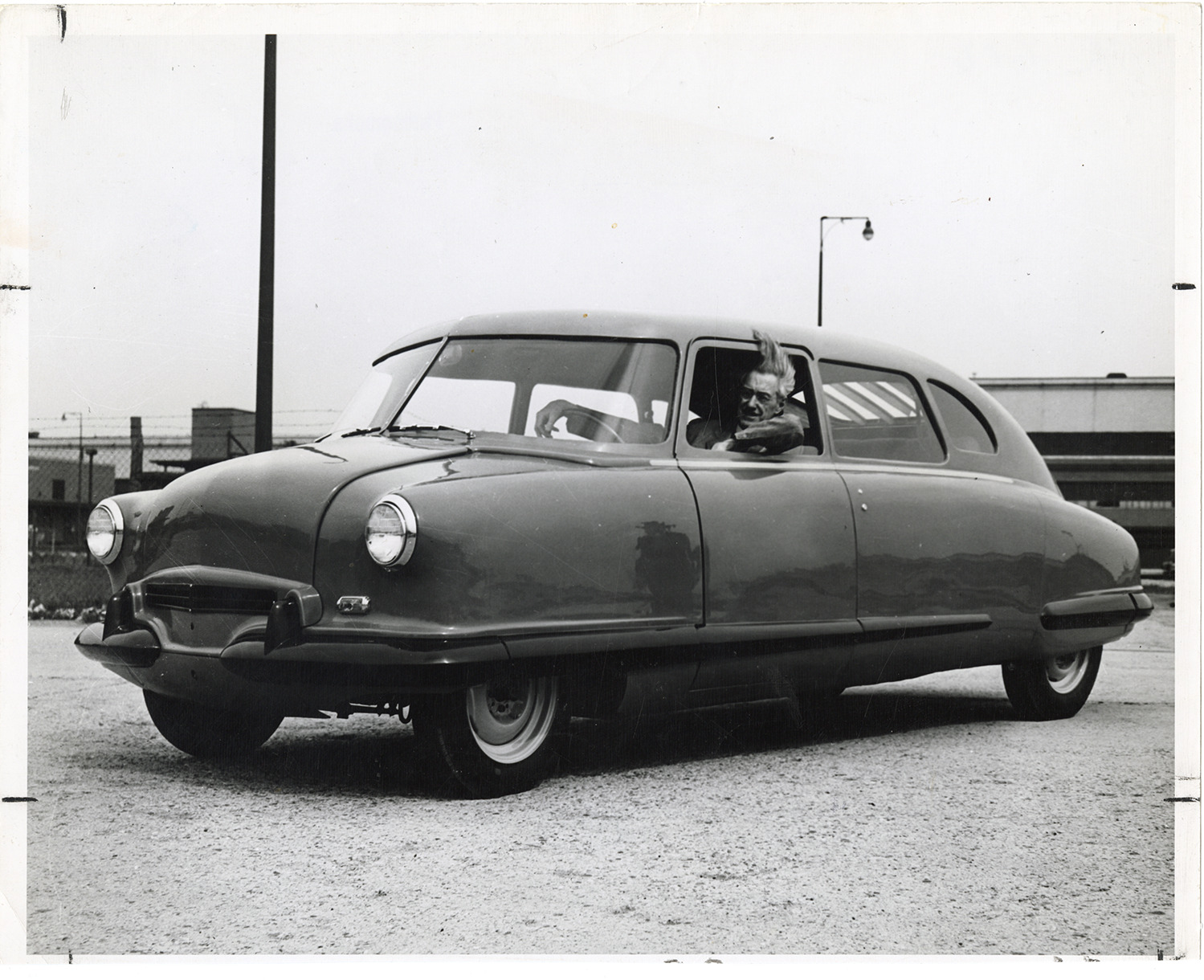 View of William Bushnell Stout posing in a 1946 Scarab automobile. Label on back: "Picture no. 6. Text: America in Motion (preface). William B. Stout, creator of the rear-engine Scarab, up to 1946 kept trying to interest the American automotive industry in his unique, roomy model. Though successful in many endeavors, Detroit's Da Vinci never found a backer for his car." Handwritten on back: "1946."