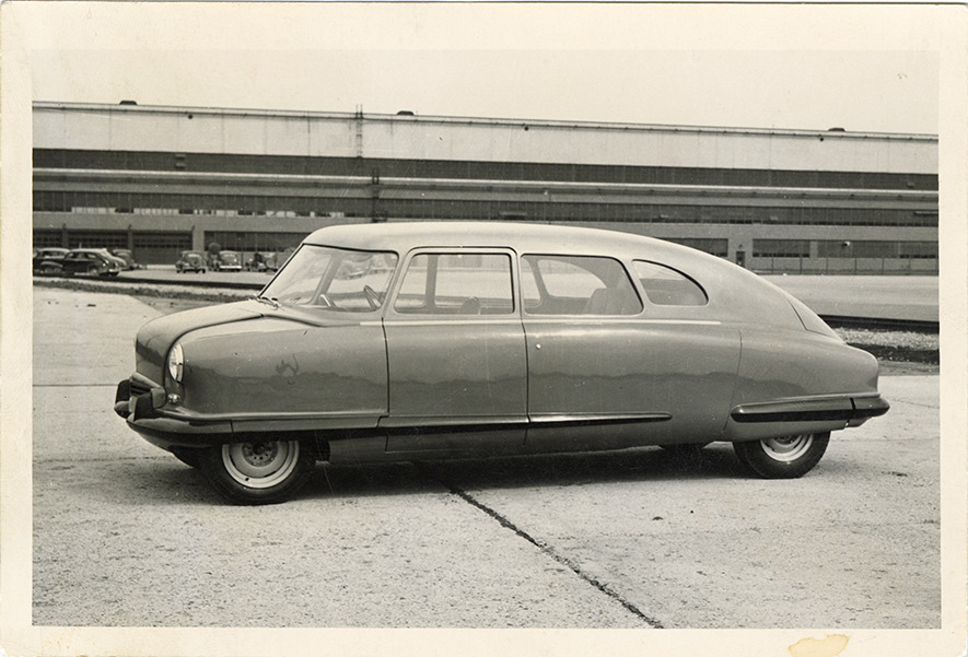 View of a 1946 Scarab automobile. Label on back: "Final form of the Scarab rear engine car. This all fiber glass body was built for the Graham-Paige Company to show the possibilities of this material in body building. Practically all modern cars have copied this style." Handwritten on back: "1946."