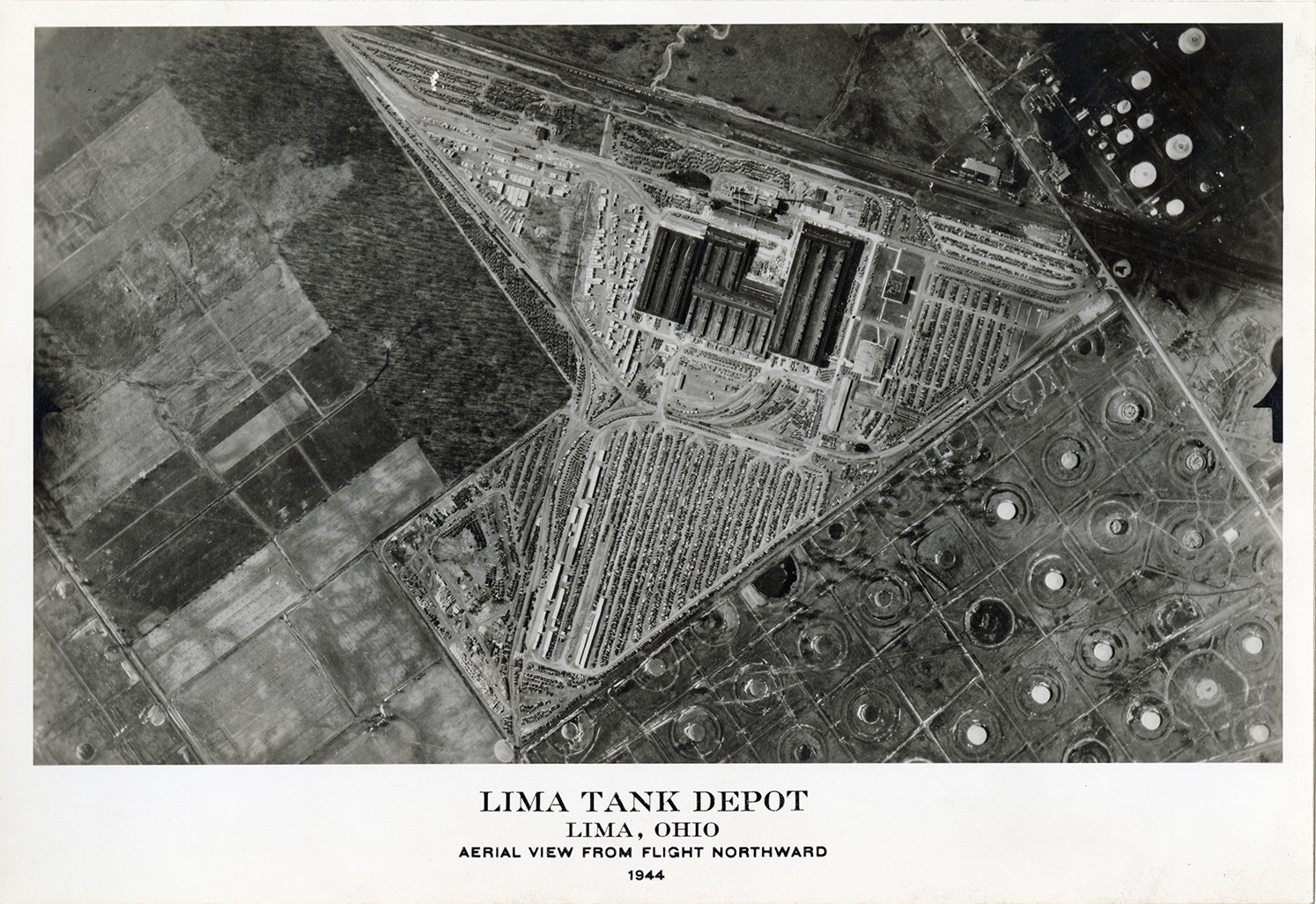Favorite this☆ Aerial view of Lima Tank Depot, Lima, Ohio Description: Bird's-eye view of the Lima Tank Depot, Lima, Ohio. Printed on front: "Lima Tank Depot, Lima, Ohio. Aerial view from flight northward, 1944." Details Resource ID: na052682 Creator: United States. War Production Board Subject: Factories--Ohio--Lima Defense industries--Ohio--Lima Photographic prints Note (Source): Part of a collection of photographs documenting factories across Michigan and Ohio that were converted from civilian to military production during World War II. Date Issued: 1944 Format: 1 photographic print mounted on fabric ; 7 x 10 in. Member of: National Automotive History Collection Filing Location: MS125/Michigan and Ohio Wartime Production Architecture, 1:1 Rights: Physical rights are retained by DPL. Copyright is retained in accordance with U.S. copyright laws.