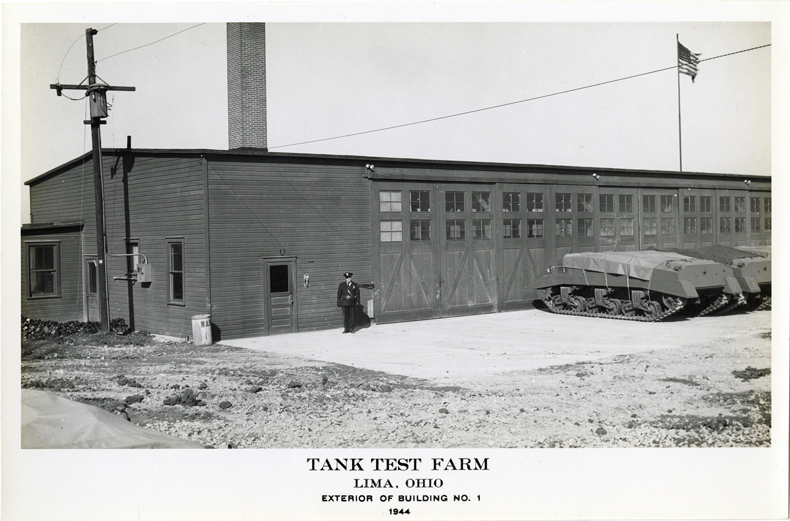 View of uniformed guard or military personnel posing in front of Building no. 1 at the Tank Test Farm, Lima, Ohio. Tanks on right. Printed on front: "Tank Test Farm, Lima, Ohio. Exterior of Building no. 1, 1944."