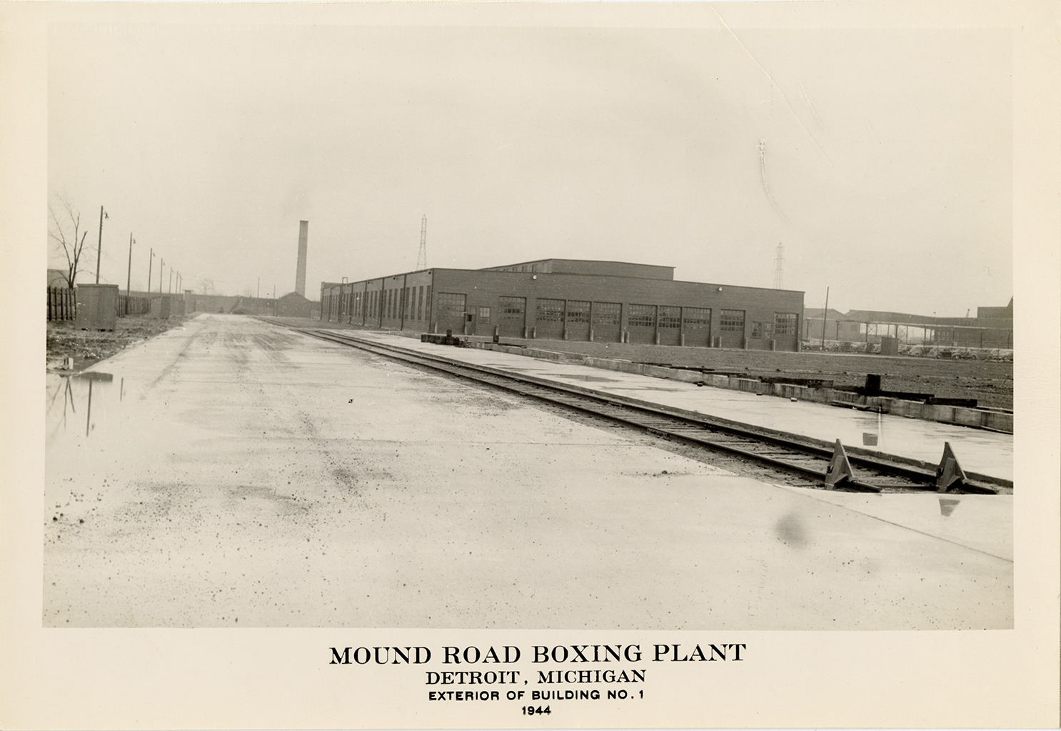 Favorite this☆ Building no. 1, Mound Road Boxing Plant, Detroit, Michigan Description: View of Building no. 1, Mound Road Boxing Plant, Detroit, Michigan. Printed on front: "Mound Road Boxing Plant, Detroit, Michigan. Exterior of Building no. 1, 1944." Details Resource ID: na052689 Creator: United States. War Production Board Subject: Factories--Michigan--Detroit Military trucks--Transportation Defense industries--Michigan--Detroit Photographic prints Note (Source): Part of a collection of photographs documenting factories across Michigan and Ohio that were converted from civilian to military production during World War II. Date Issued: 1944 Format: 1 photographic print mounted on fabric ; 6.75 x 10 in. Member of: National Automotive History Collection Filing Location: MS125/Michigan and Ohio Wartime Production Architecture, 1:5 Rights: Physical rights are retained by DPL. Copyright is retained in accordance with U.S. copyright laws.