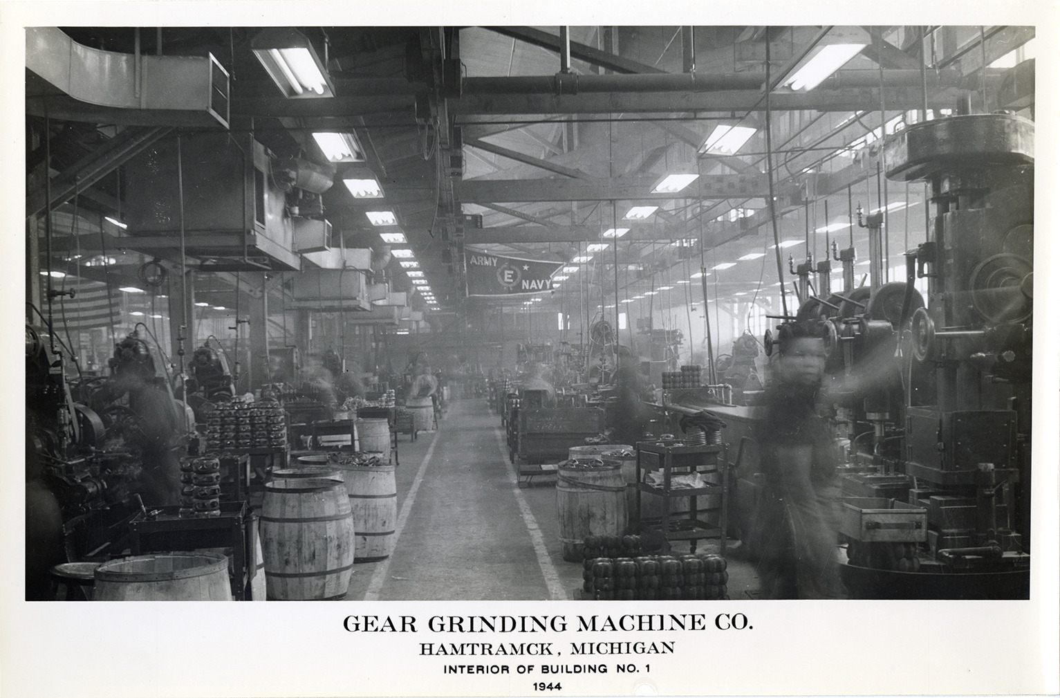 View of men working at machines in Building no. 1, Gear Grinding Machine Co., Hamtramck, Michigan. Barrels in foreground; Army-Navy flag in background. Printed on front: "Gear Grinding Machine Co., Hamtramck, Michigan. Interior of Building no. 1, 1944."