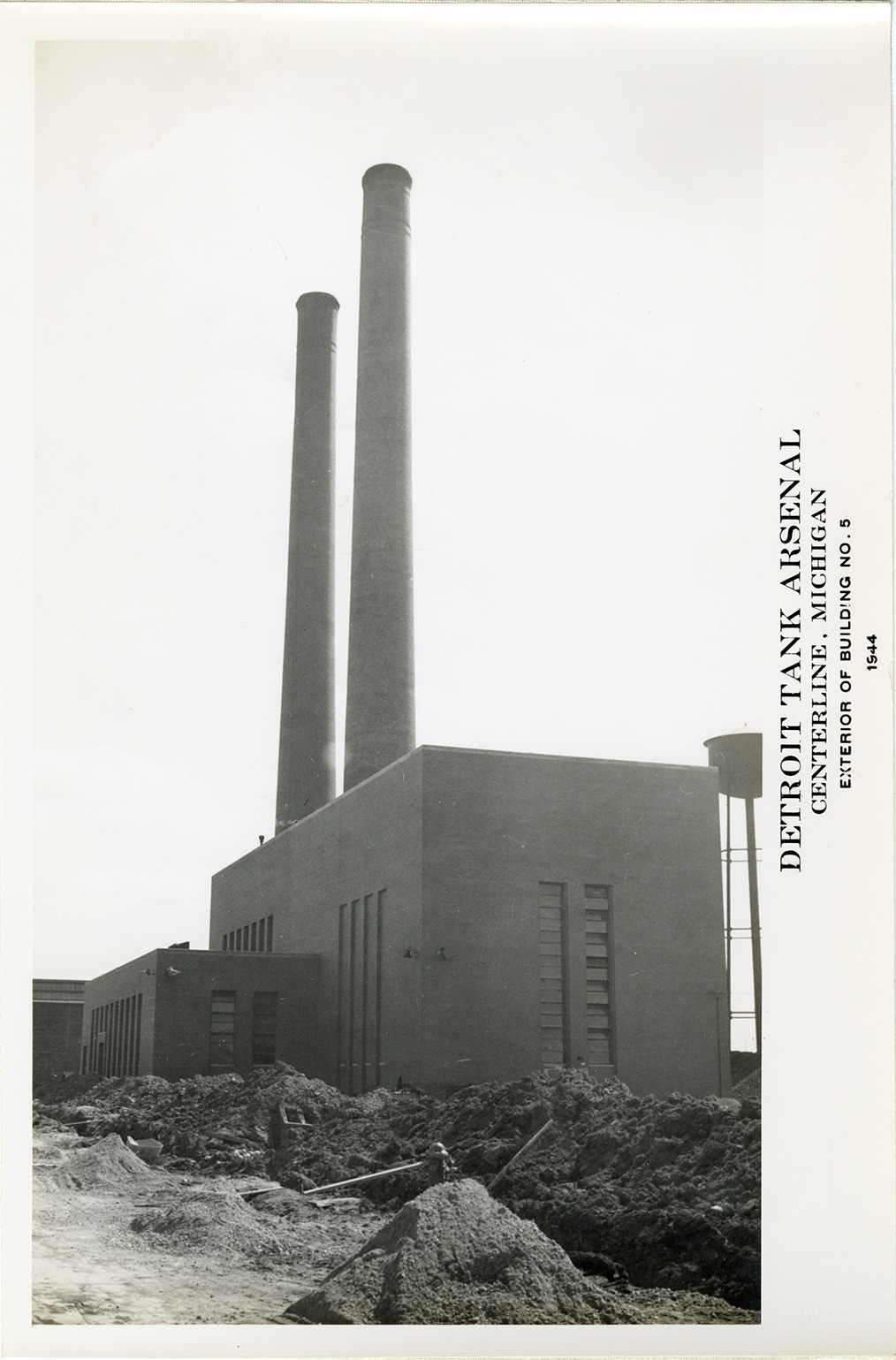 View of Building no. 5, Detroit Tank Arsenal, Center Line, Michigan, showing smokestacks. Printed on front: "Detroit Tank Arsenal, Centerline, Michigan. Exterior of Building no. 5, 1944."