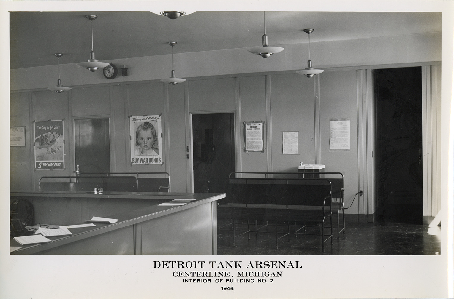 Interior view of Building no. 2, Detroit Tank Arsenal, Center Line, Michigan, showing reception desk and seating in waiting room. Posters displayed on wall in background. Printed on front: "Detroit Tank Arsenal, Centerline, Michigan. Interior of Building no. 2, 1944."