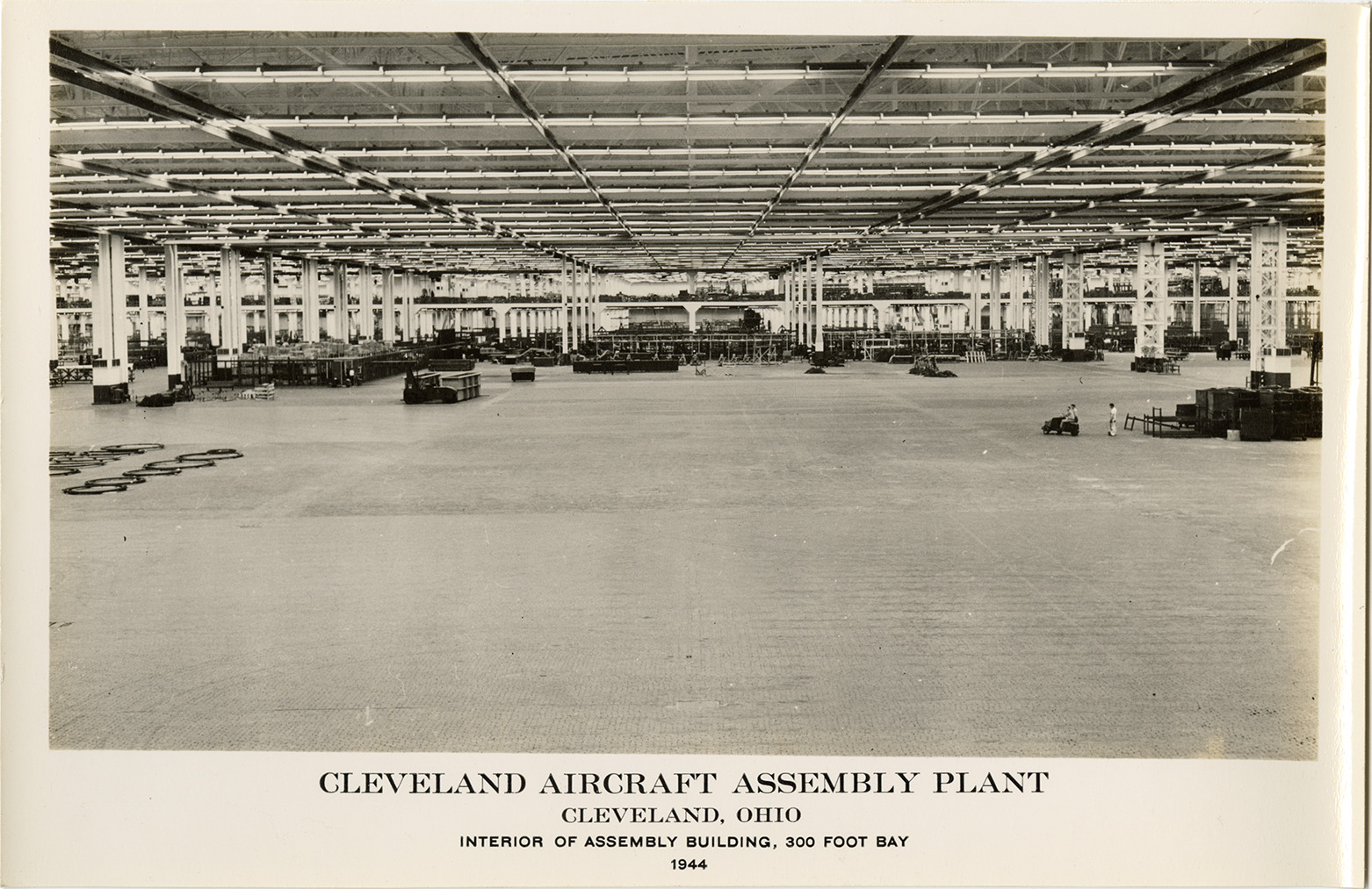 Favorite this☆ Interior, Assembly Building, Cleveland Aircraft Assembly Plant, Cleveland, Ohio Description: Interior view of the Assembly Building, Cleveland Aircraft Assembly Plant, Cleveland, Ohio. Printed on front: "Cleveland Aircraft Assembly Plant, Cleveland, Ohio. Interior of Assembly Building, 300 foot bay, 1944." Stamped on back: "Fisher Body Photographic, General Motors Bldg., Detroit, Mich. Restricted." Details Resource ID: na052753 Creator: Fisher Body Photographic Subject: Airplanes, Military--Ohio--Cleveland--Design and construction Factories--Ohio--Cleveland Defense industries--Ohio--Cleveland Photographers--Michigan--Detroit Photographic prints Note (Source): Part of a collection of photographs documenting factories across Michigan and Ohio that were converted from civilian to military production during World War II. Date Issued: 1944 Format: 1 photographic print mounted on fabric ; 7 x 10 in. Member of: National Automotive History Collection Filing Location: MS125/Michigan and Ohio Wartime Production Architecture, 1:12 Rights: Physical rights are retained by DPL. Copyright is retained in accordance with U.S. copyright laws.