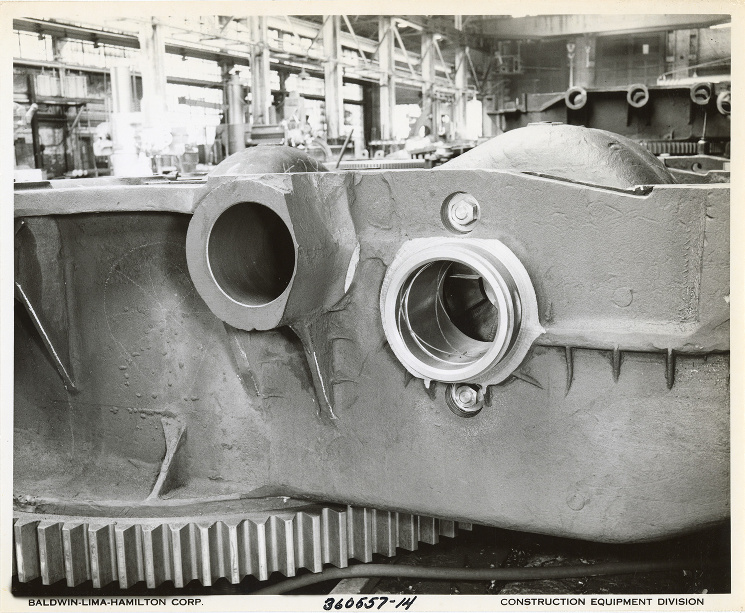 View of truck after machining for a Type 1601 crane shovel manufactured by the Baldwin-Lima-Hamilton Corporation. Printed on front: "Baldwin-Lima-Hamilton Corp. 360557-14. Construction Equipment Division." Handwritten on back: "Type 1601. Truck after machining."
