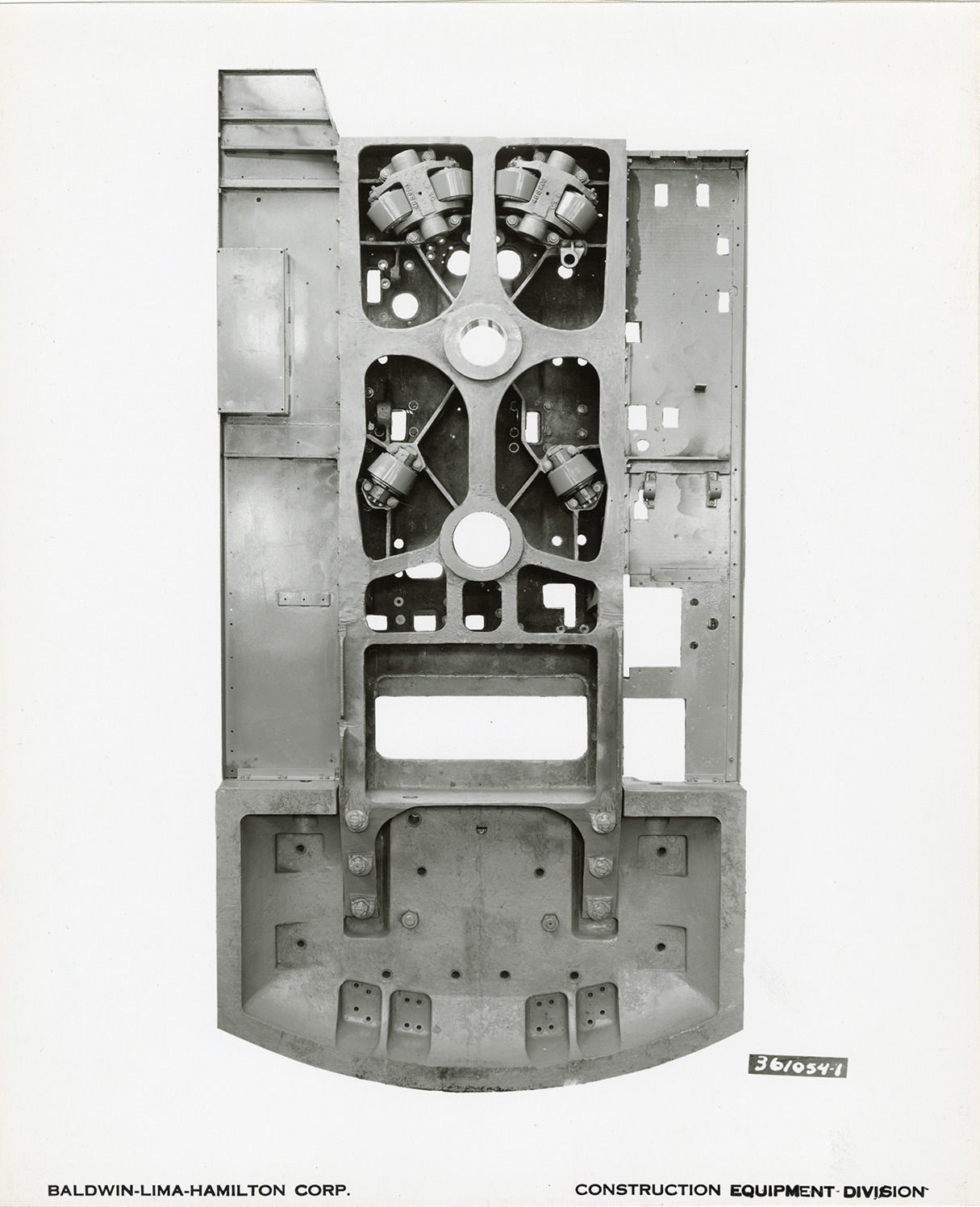 View of S.V. rotate base for a Type 1601 crane shovel manufactured by the Baldwin-Lima-Hamilton Corporation. Printed on front: "Baldwin-Lima-Hamilton Corp. 361054-1. Construction Equipment Division." Handwritten on back: "Type 1601. S.V. rotate base."