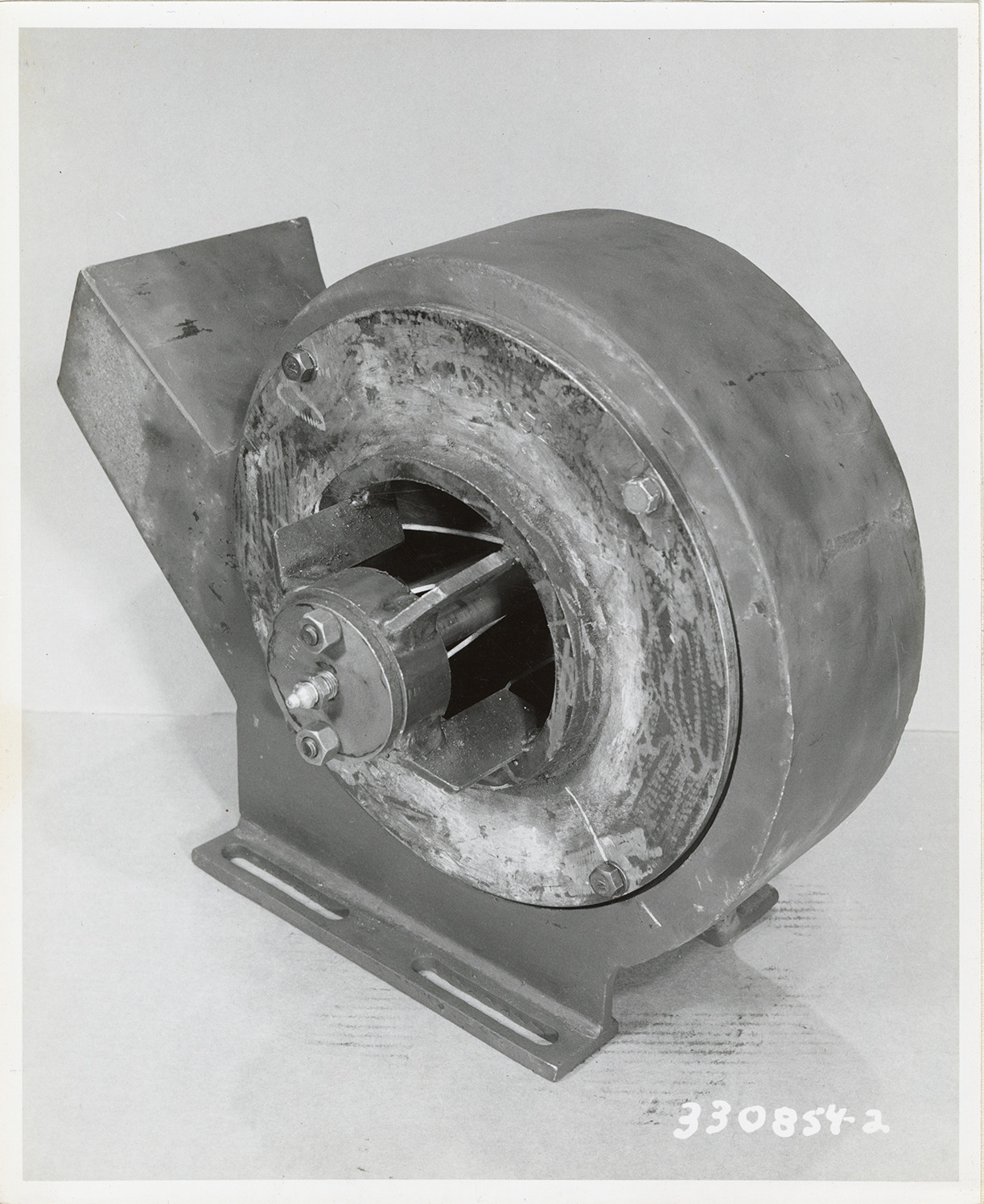 View of a swing shaft clutch blower for a Type 1201 crane shovel manufactured by the Baldwin-Lima-Hamilton Corporation. Printed on front: "Baldwin-Lima-Hamilton Corp. 330854-2. Construction Equipment Division." Handwritten on back: "Type 1201. Swing shaft clutch blower."