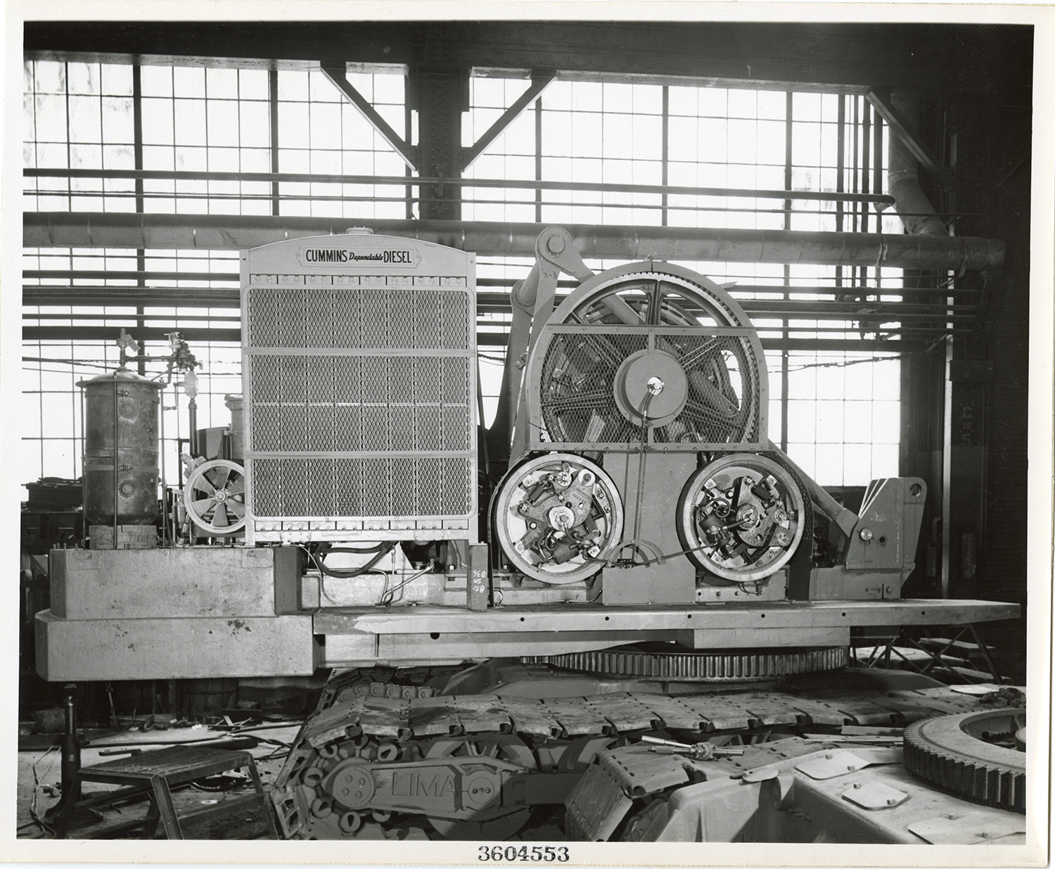 View of the upper works for a Type 1601 crane shovel manufactured by the Baldwin-Lima-Hamilton Corporation. Printed on front: "Baldwin-Lima-Hamilton Corp. 3604553. Construction Equipment Division." Handwritten on back: "Type 1601. Upper works."