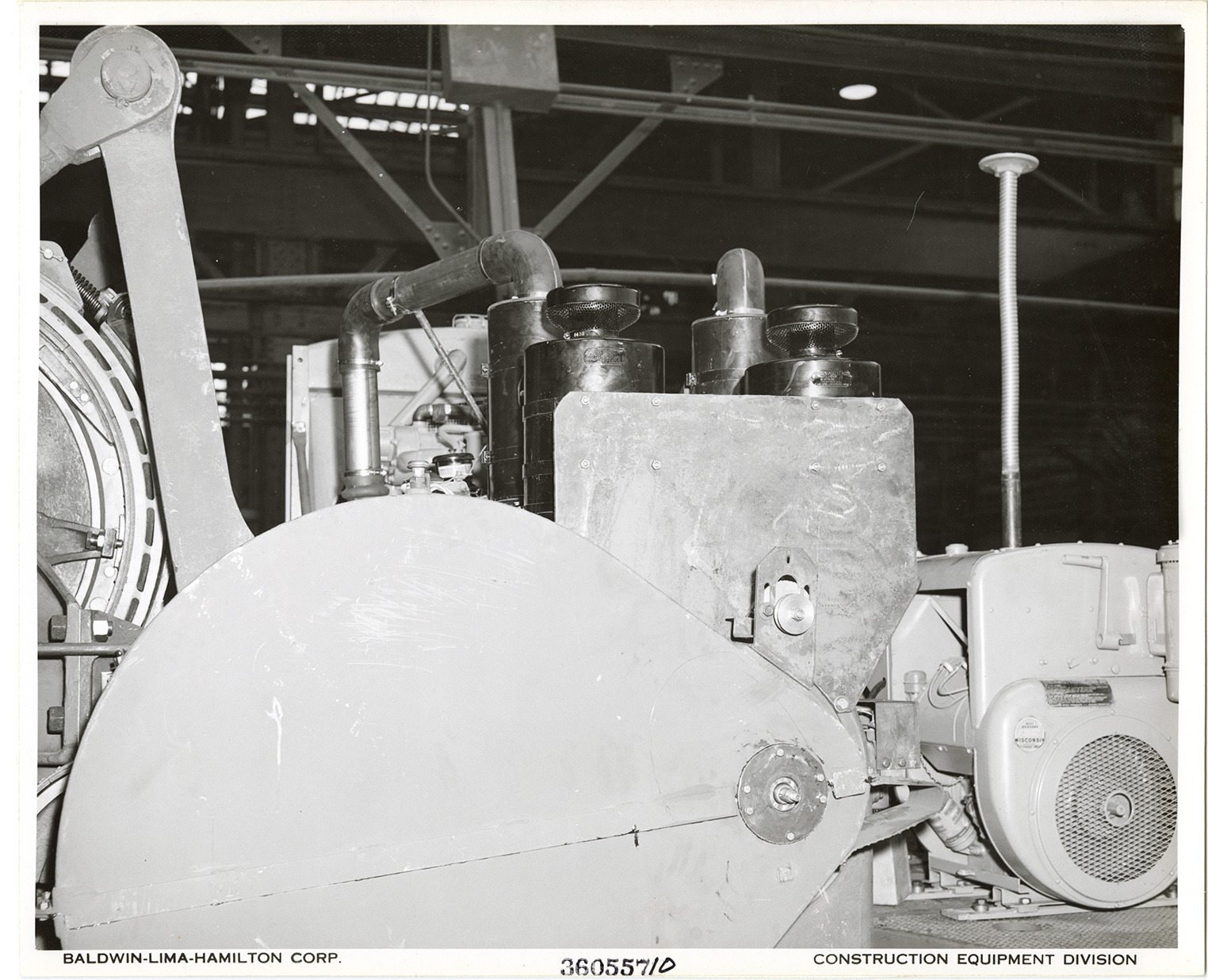 View of a Cummins diesel engine for a Type 1601 crane shovel manufactured by the Baldwin-Lima-Hamilton Corporation. Printed on front: "Baldwin-Lima-Hamilton Corp. 36055710. Construction Equipment Division." Handwritten on back: "Type 1601. Cummins engine."
