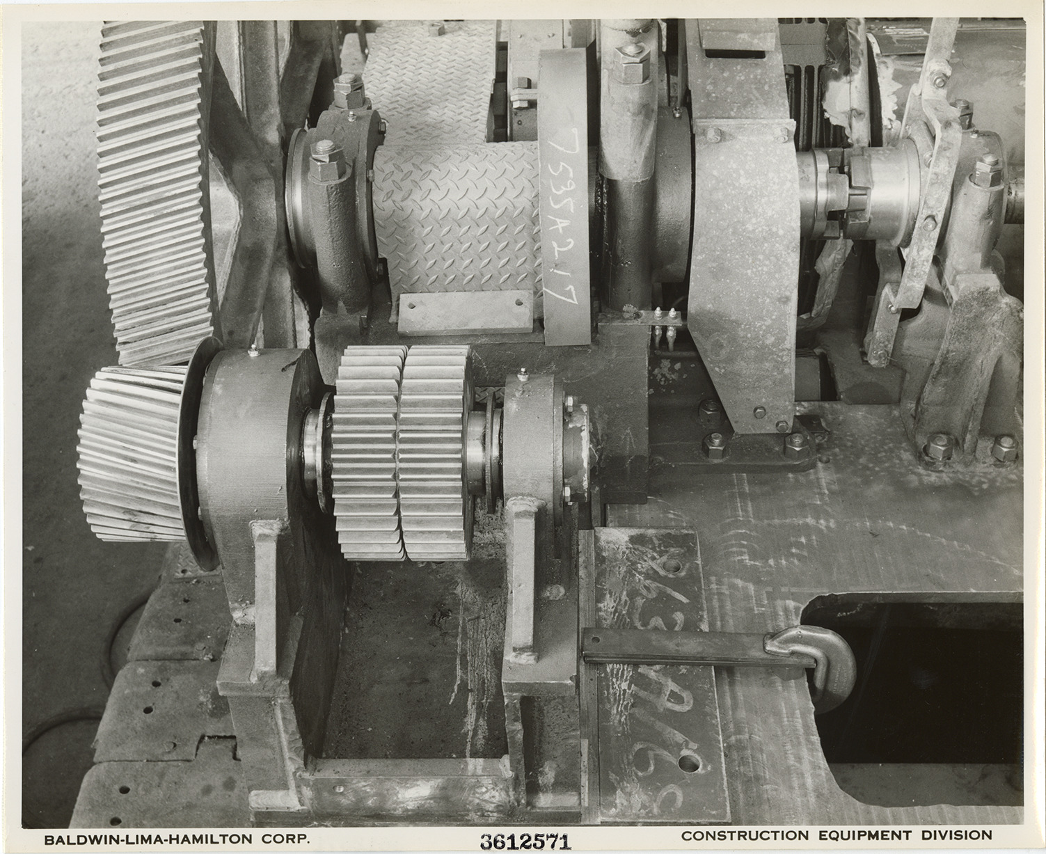 Close-up view of a Westinghouse power plant for a Type 1601 crane shovel manufactured by the Baldwin-Lima-Hamilton Corporation. Printed on front: "Baldwin-Lima-Hamilton Corp. 3612571. Construction Equipment Division." Handwritten on back: "Type 1601 shovel. Westinghouse power plant installation."