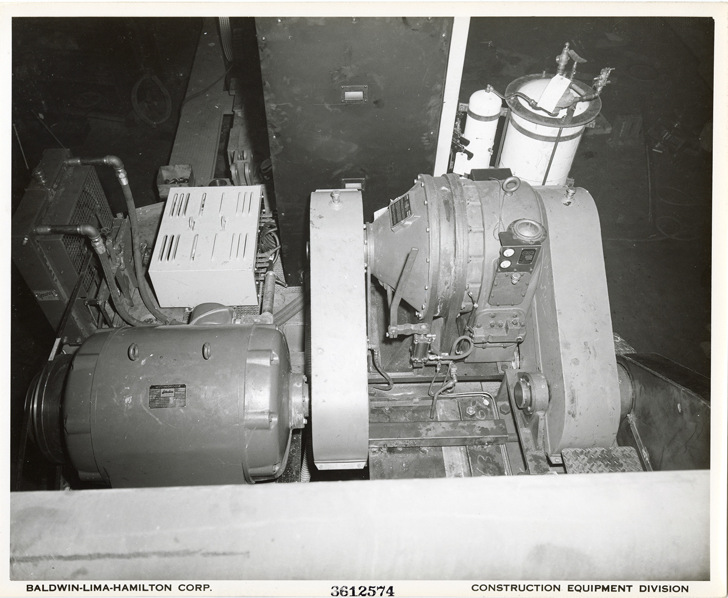 Close-up view of a Westinghouse power plant for a Type 1601 crane shovel manufactured by the Baldwin-Lima-Hamilton Corporation. Printed on front: "Baldwin-Lima-Hamilton Corp. 3612574. Construction Equipment Division." Handwritten on back: "Type 1601 shovel. Westinghouse power plant installation."