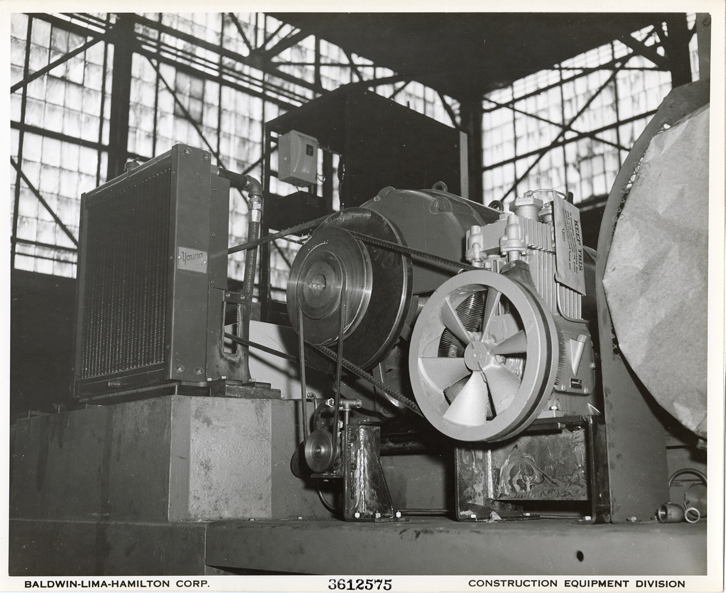 View of a Westinghouse power plant for a Type 1601 crane shovel manufactured by the Baldwin-Lima-Hamilton Corporation. Printed on front: "Baldwin-Lima-Hamilton Corp. 3612575. Construction Equipment Division." Handwritten on back: "Type 1601 shovel. Westinghouse power plant installation."