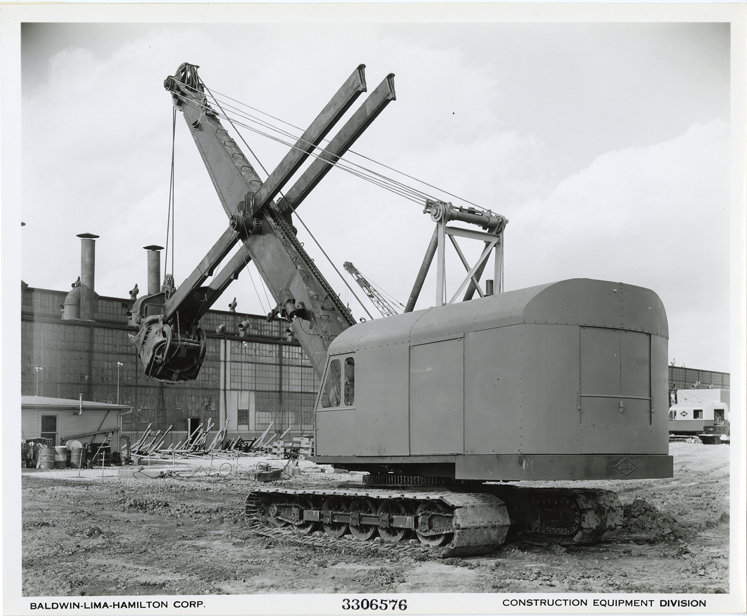 View of a Type 1201 crane shovel manufactured by the Baldwin-Lima-Hamilton Corporation. Printed on front: "Baldwin-Lima-Hamilton Corp. 3306576. Construction Equipment Division." Handwritten on back: "Type 1201 shovel."