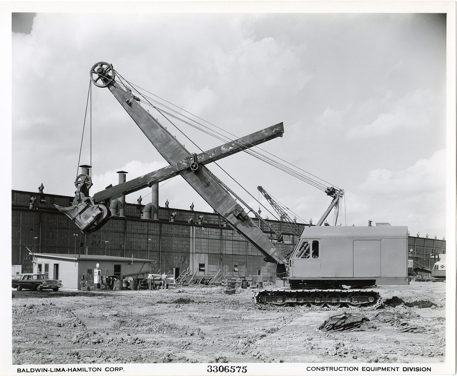 View of a Type 1201 crane shovel manufactured by the Baldwin-Lima-Hamilton Corporation. Printed on front: "Baldwin-Lima-Hamilton Corp. 3306575. Construction Equipment Division." Handwritten on back: "Type 1201 shovel."