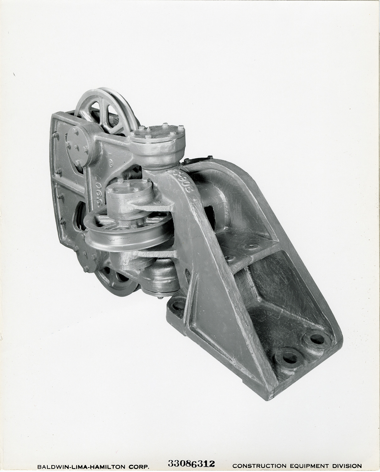 View of an unidentified component for a crane shovel manufactured by the Baldwin-Lima-Hamilton Corporation. Printed on front: "Baldwin-Lima-Hamilton Corp. 33086312. Construction Equipment Division."