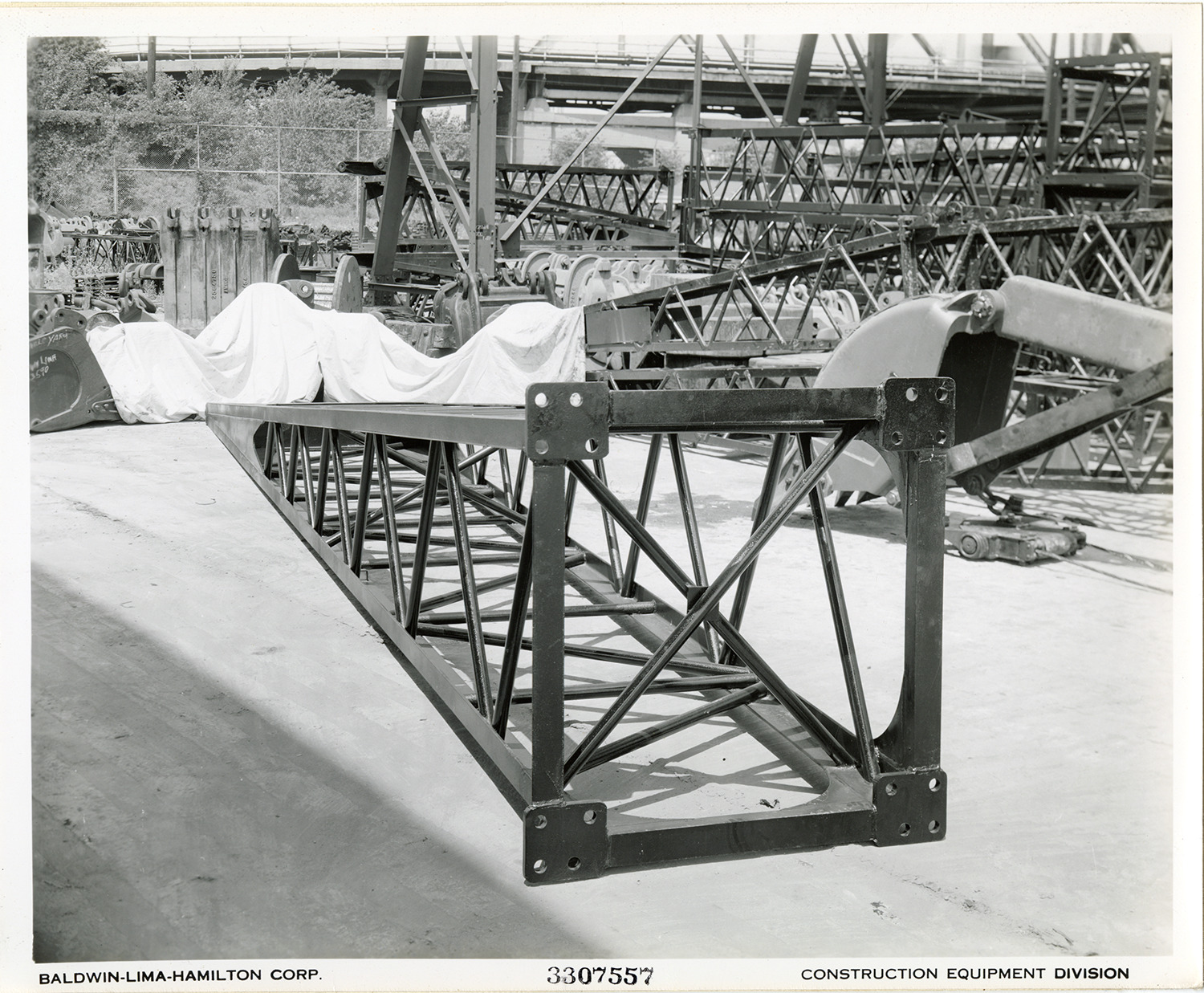 View of bolt type boom for a Type 1201 crane shovel manufactured by the Baldwin-Lima-Hamilton Corporation. Printed on front: "Baldwin-Lima-Hamilton Corp. 3307557. Construction Equipment Division." Handwritten on back: "Type 1201, bolt type boom."