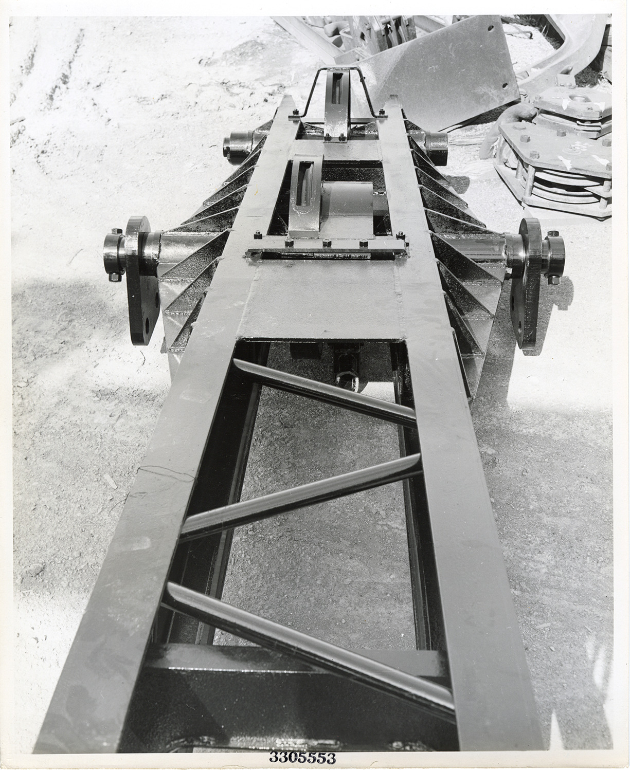 View of a point shaft assembly for a Type 1201 crane shovel manufactured by the Baldwin-Lima-Hamilton Corporation. Printed on front: "Baldwin-Lima-Hamilton Corp. 3305553. Construction Equipment Division." Handwritten on back: "Type 1201, point shaft assembly."