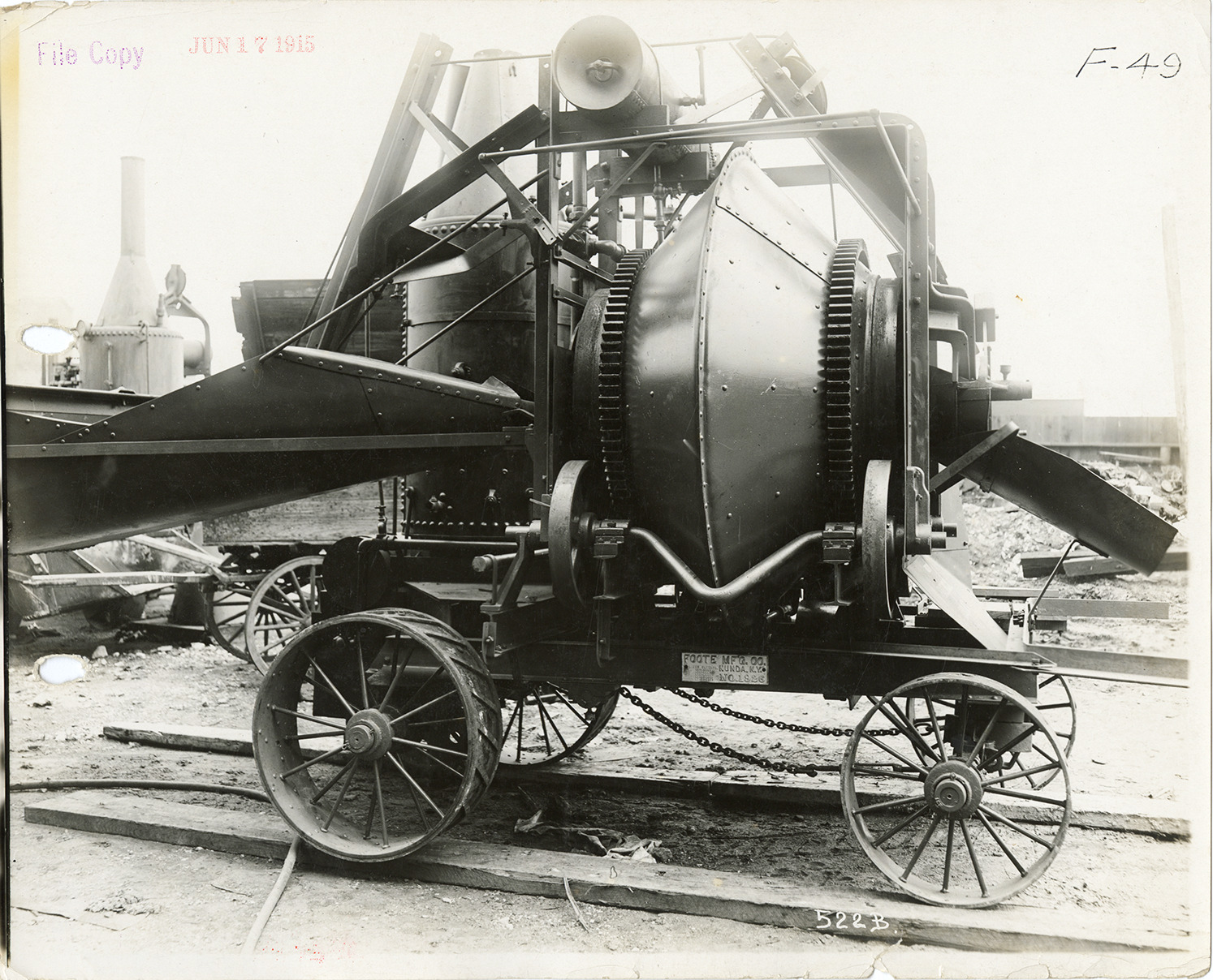 View of a Foote concrete mixer no. 1926. Handwritten on back: "6A, #1926. H-416 stop [undecipherable] in position for discharging water into mixing drum."
