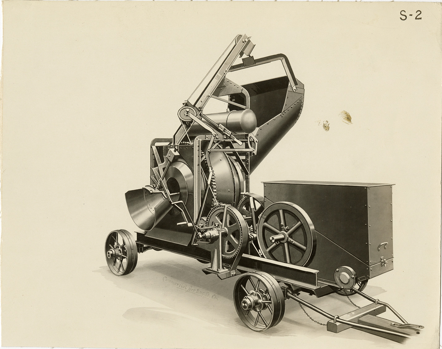 Artist's depiction of a Foote concrete mixer. Printed on front: "Commercial Art Eng. Co. Chi."