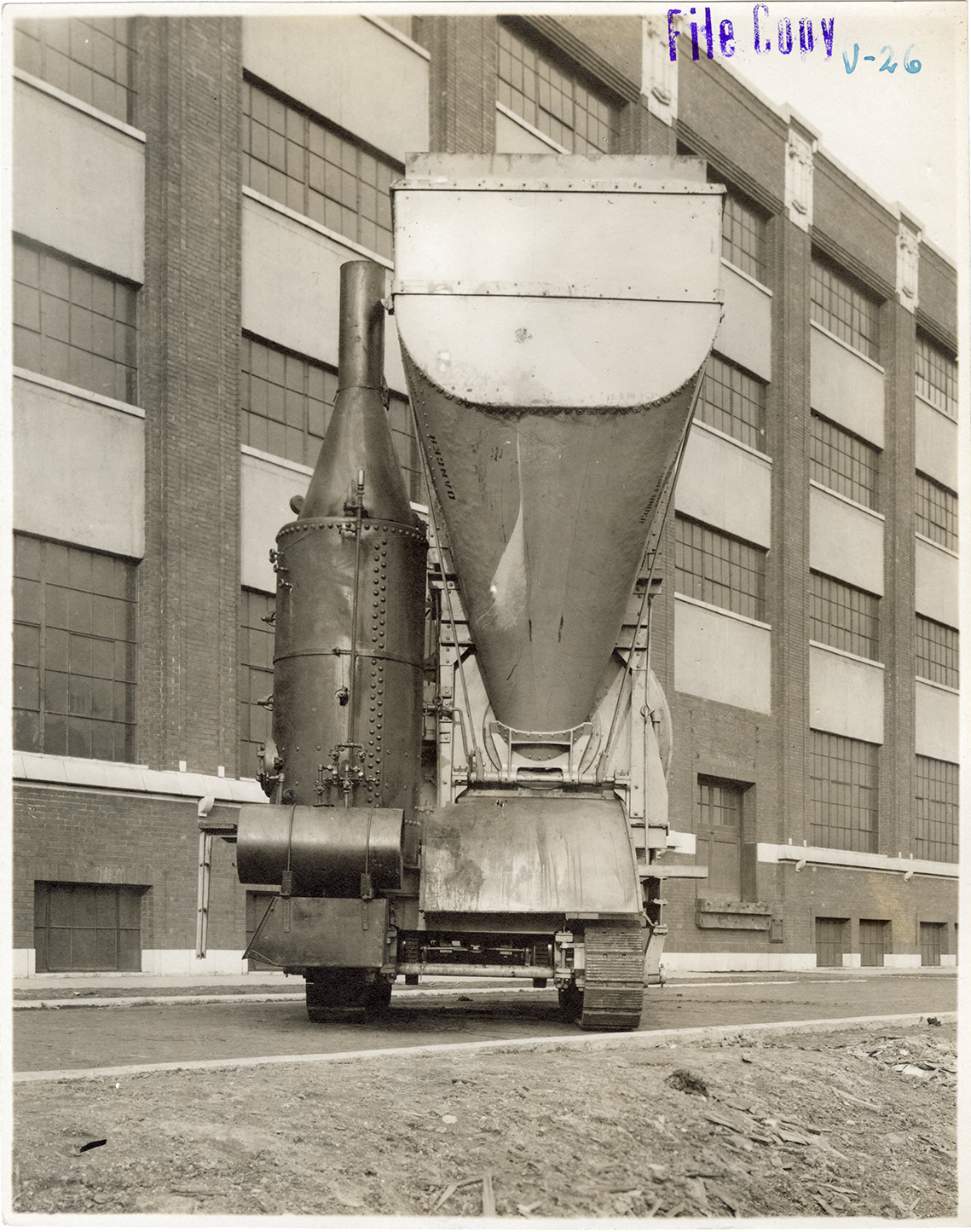 View of a Foote 21E MultiFoote mixer. Factory building in background. Typed on back: "V-26 21E MultiFoote with boom and bucket (taken from charging side with skip up). Taken in Chicago, March, 1921."